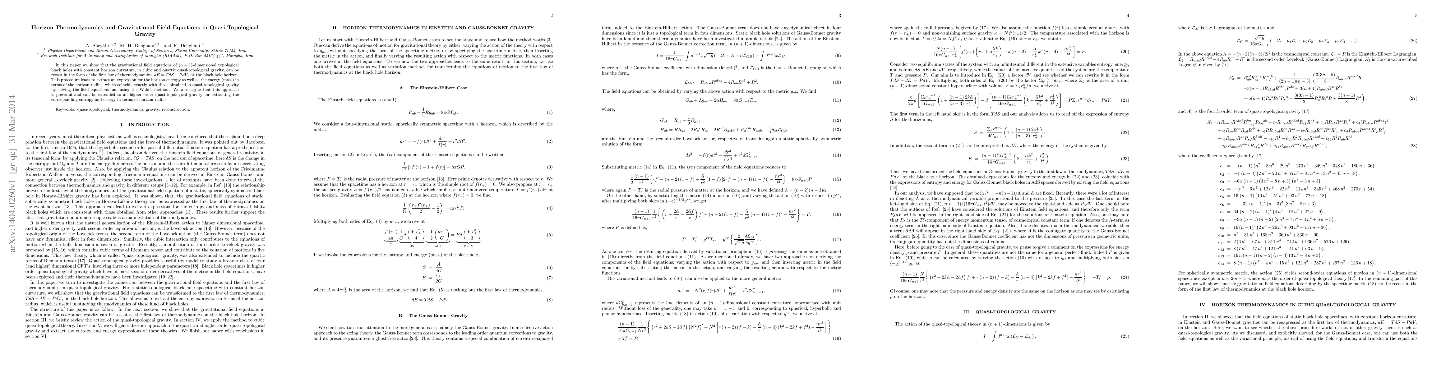 This paper demonstrates that gravitational field equations in quasi-topological gravity can be reformulated as the first law of thermodynamics at the black hole horizon, yielding expressions for horizon entropy and energy in terms of the horizon radius, consistent with results from Wald's method. The approach is proposed to be applicable to higher-order quasi-topological gravity.