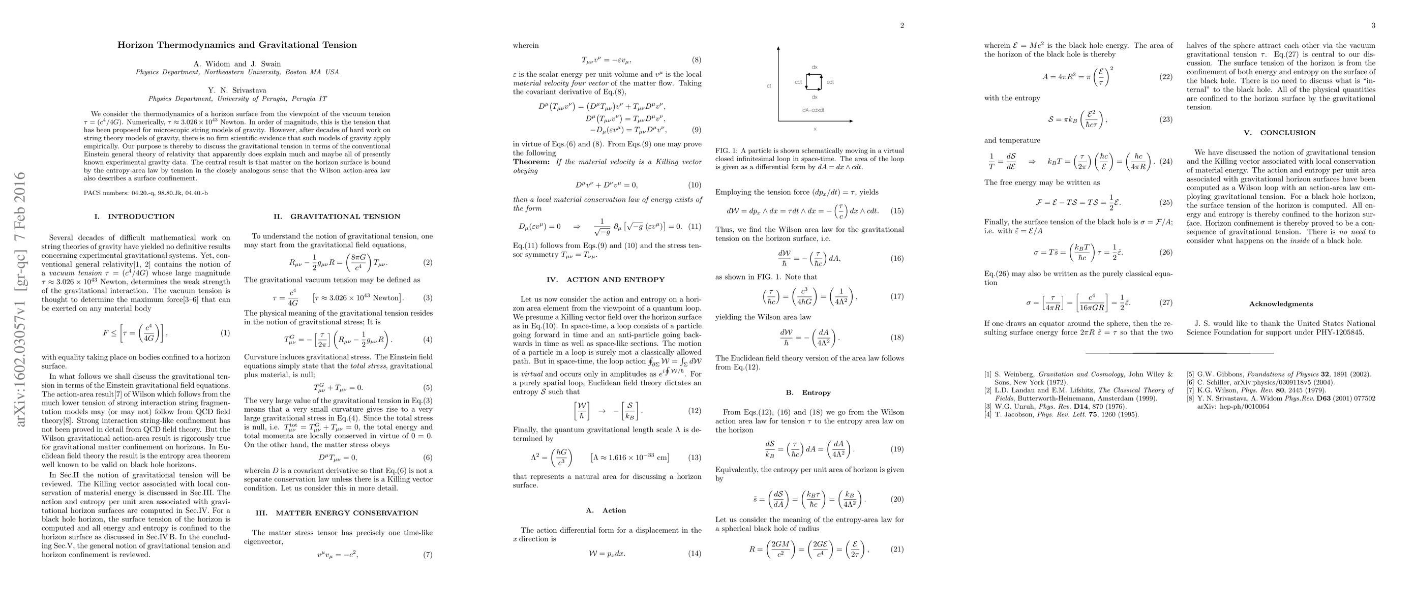 We consider the thermodynamics of a horizon surface from the viewpoint of the vacuum tension $\tau =(c^4/4G )$. Numerically, $\tau \approx 3.026\times 10^{43}$ Newton. In order of magnitude, this is the tension that has been proposed for microscopic string models of gravity. However, after decades of hard work on string theory models of gravity, there is no firm scientific evidence that such models of gravity apply empirically. Our purpose is thereby to discuss the gravitational tension in terms of the conventional Einstein general theory of relativity that apparently does explain much and maybe all of presently known experimental gravity data. The central result is that matter on the horizon surface is bound by the entropy-area law by tension in the closely analogous sense that the Wilson action-area law also describes a surface confinement.