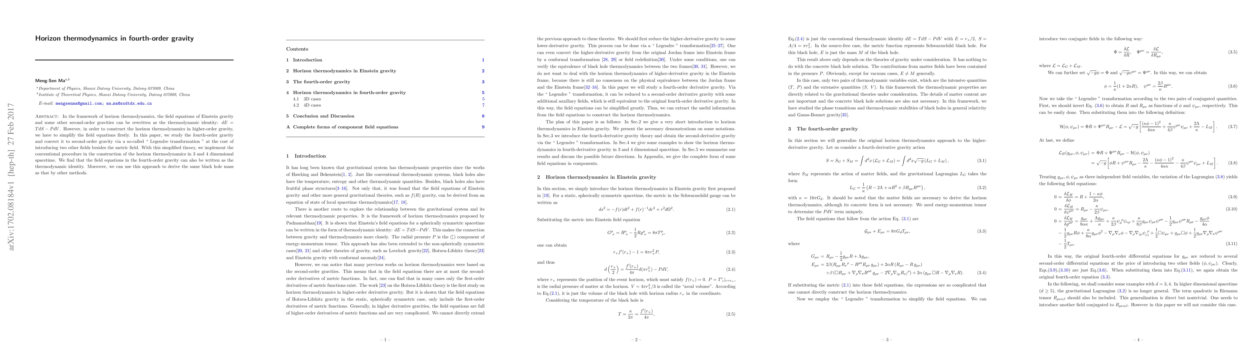 This paper explores the application of horizon thermodynamics to fourth-order gravity by converting it to a simplified second-order form via a Legendre transformation, introducing additional fields. The study confirms that the field equations can be expressed as a thermodynamic identity, consistent with black hole mass calculations from other methods.