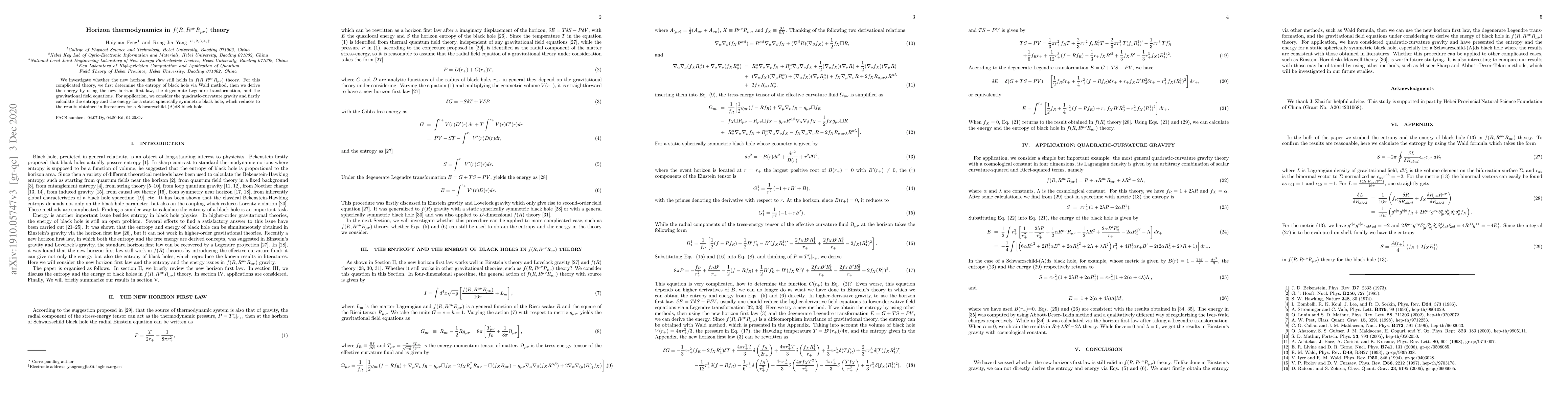 We investigate whether the new horizon first law still holds in $f(R,R^{\mu\nu}R_{\mu\nu})$ theory. For this complicated theory, we first determine the entropy of black hole via Wald method, then we derive the energy by using the new horizon first law, the degenerate Legendre transformation, and the gravitational field equations. For application, we consider the quadratic-curvature gravity and firstly calculate the entropy and the energy for a static spherically symmetric black hole, which reduces to the results obtained in literatures for a Schwarzschild-(A)dS black hole.