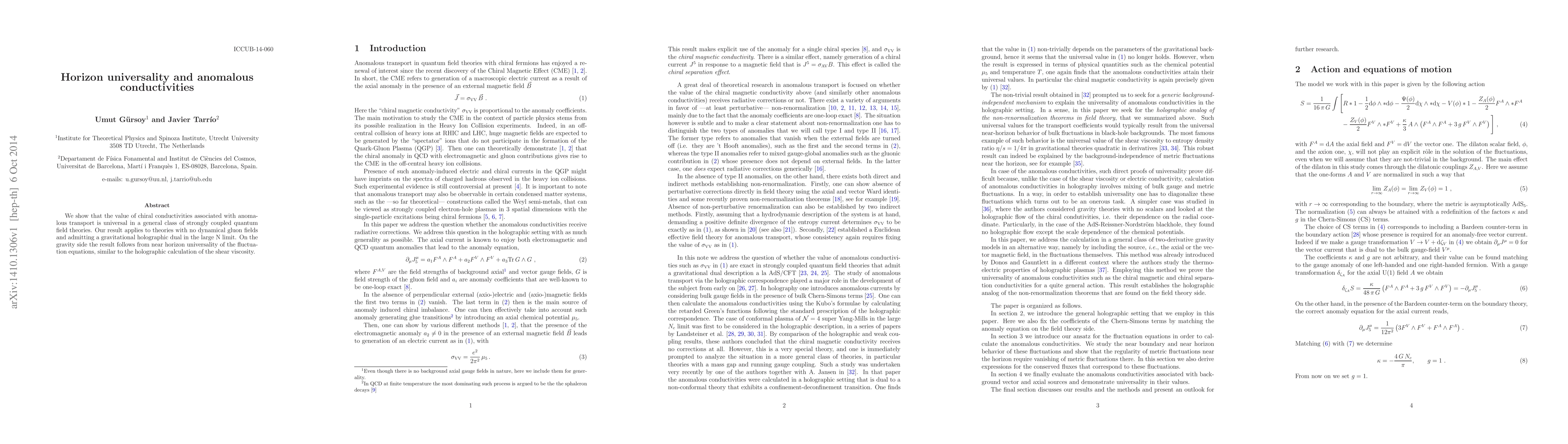 This paper demonstrates that chiral conductivities in a broad category of strongly coupled quantum field theories are universally determined, regardless of specific details, provided they lack dynamical gluon fields and have a gravitational holographic dual. The universality is derived from the near-horizon behavior of fluctuation equations in the gravitational description.