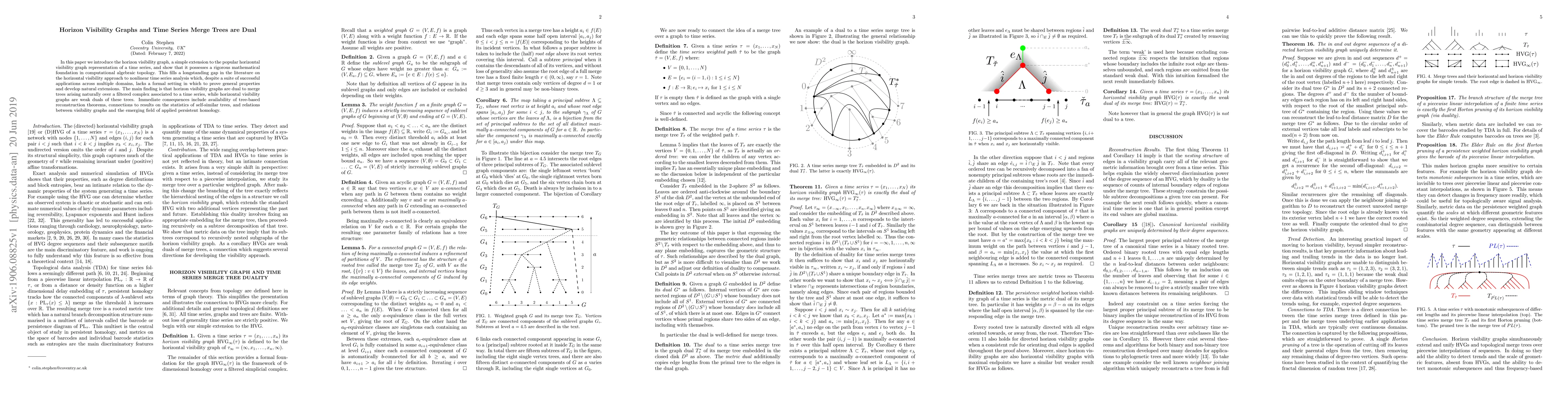This paper introduces horizon visibility graphs as an extension of horizontal visibility graphs for time series, establishing a rigorous mathematical foundation in computational algebraic topology. It reveals that horizon visibility graphs are dual to merge trees, providing new reconstruction theorems, statistical insights, and connections to applied persistent homology.