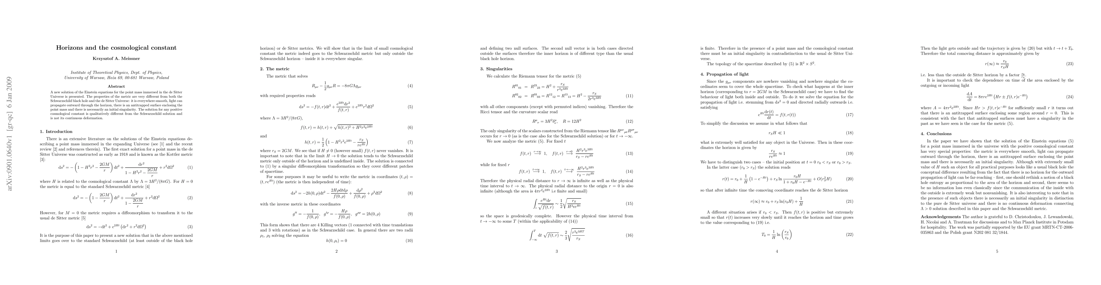 A new solution of the Einstein equations for the point mass immersed in the de Sitter Universe is presented. The properties of the metric are very different from both the Schwarzschild black hole and the de Sitter Universe: it is everywhere smooth, light can propagate outward through the horizon, there is an antitrapped surface enclosing the point mass and there is necessarily an initial singularity. The solution for any positive cosmological constant is qualitatively different from the Schwarzschild solution and is not its continuous deformation.