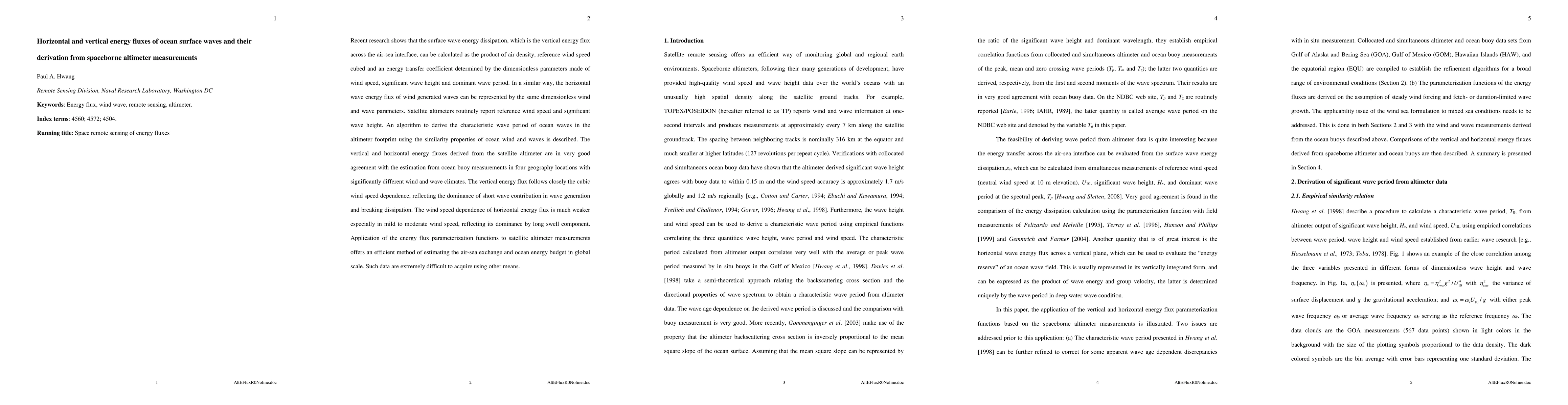 Recent research shows that the surface wave energy dissipation, which is the vertical energy flux across the air-sea interface, can be calculated as the product of air density, reference wind speed cubed and an energy transfer coefficient determined by the dimensionless parameters made of wind speed, significant wave height and dominant wave period. In a similar way, the horizontal wave energy flux of wind generated waves can be represented by the same dimensionless wind and wave parameters. Satellite altimeters routinely report reference wind speed and significant wave height. An algorithm to derive the characteristic wave period of ocean waves in the altimeter footprint using the similarity properties of ocean wind and waves is described. The vertical and horizontal energy fluxes derived from the satellite altimeter are in very good agreement with the estimation from ocean buoy measurements in four geography locations with significantly different wind and wave climates. The vertical energy flux follows closely the cubic wind speed dependence, reflecting the dominance of short wave contribution in wave generation and breaking dissipation. The wind speed dependence of horizontal energy flux is much weaker especially in mild to moderate wind speed, reflecting its dominance by long swell component. Application of the energy flux parameterization functions to satellite altimeter measurements offers an efficient method of estimating the air-sea exchange and ocean energy budget in global scale. Such data are extremely difficult to acquire using other means.