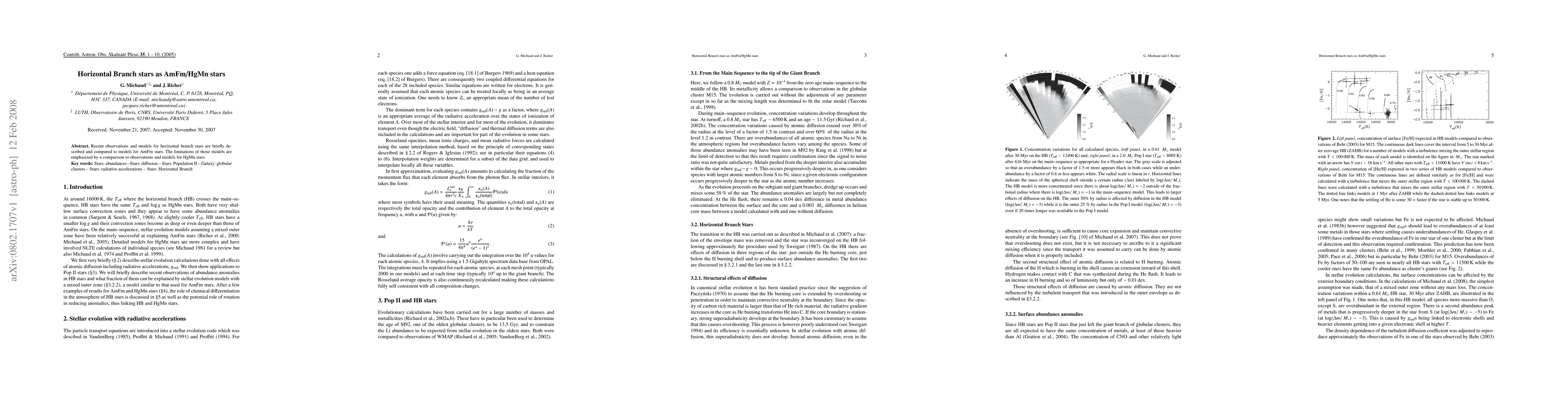 Recent observations and models for horizontal branch stars are briefly described and compared to models for AmFm stars. The limitations of those models are emphasized by a comparison to observations and models for HgMn stars.