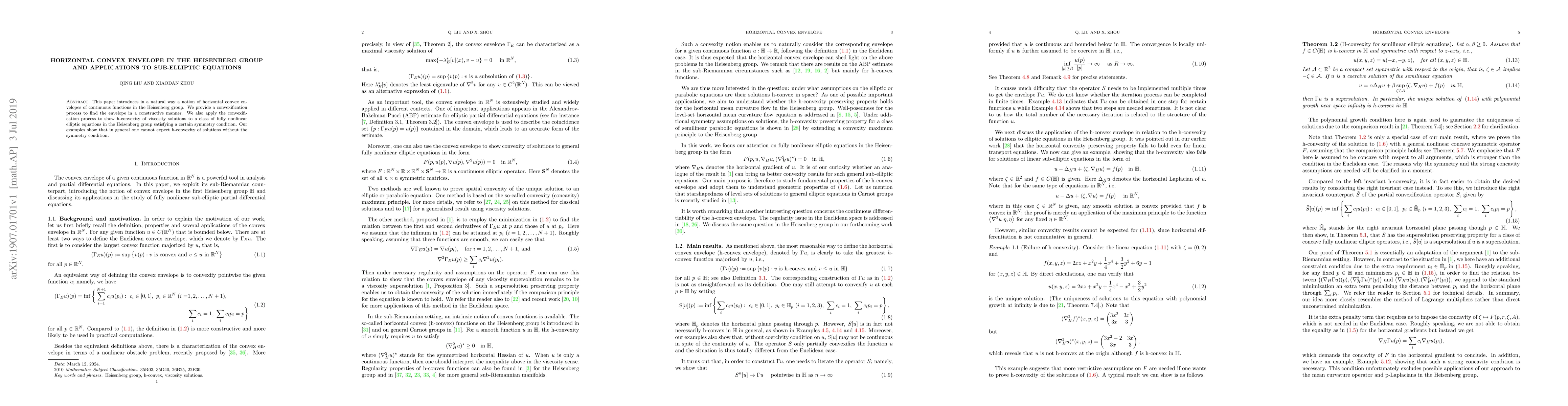 This paper defines horizontal convex envelopes in the Heisenberg group and presents a method for their construction. It applies this convexification to demonstrate the h-convexity of viscosity solutions for certain sub-elliptic equations, highlighting the necessity of symmetry conditions for such results.