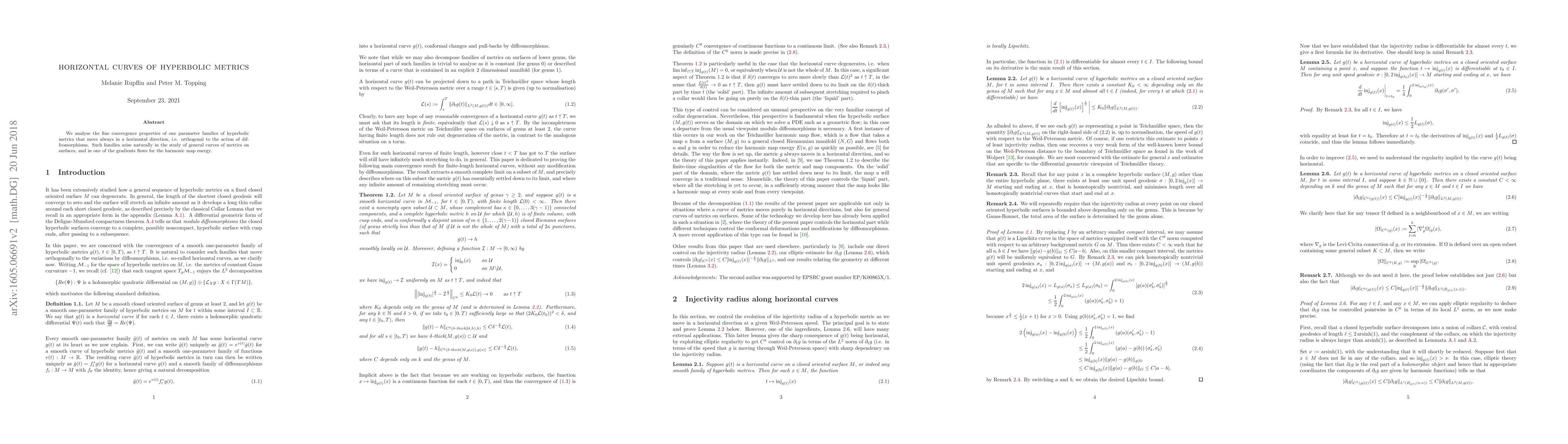 We analyse the fine convergence properties of one parameter families of hyperbolic metrics, on a fixed underlying surface, that move always in a horizontal direction, i.e. orthogonal to the action of diffeomorphisms.