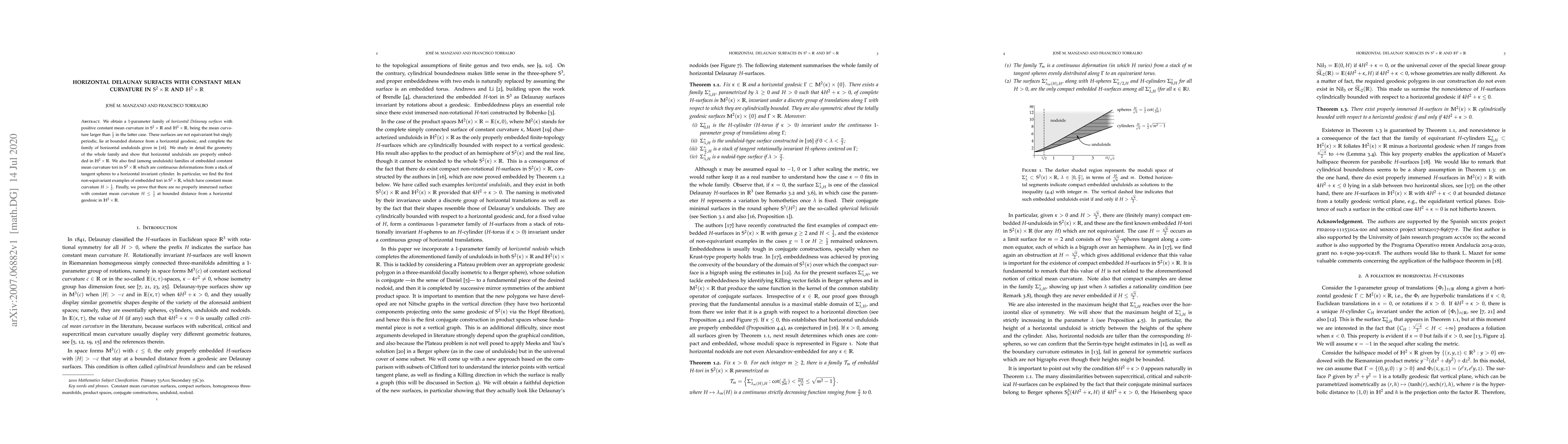 This paper presents a 1-parameter family of horizontal Delaunay surfaces with positive constant mean curvature in $\mathbb{S}^2\times\mathbb{R}$ and $\mathbb{H}^2\times\mathbb{R}$, highlighting their geometry and non-equivariance. It also finds embedded constant mean curvature tori in $\mathbb{S}^2\times\mathbb{R}$ and proves no such surfaces exist with $H\leq\frac{1}{2}$ near a horizontal geodesic in $\mathbb{H}^2\times\mathbb{R}$.