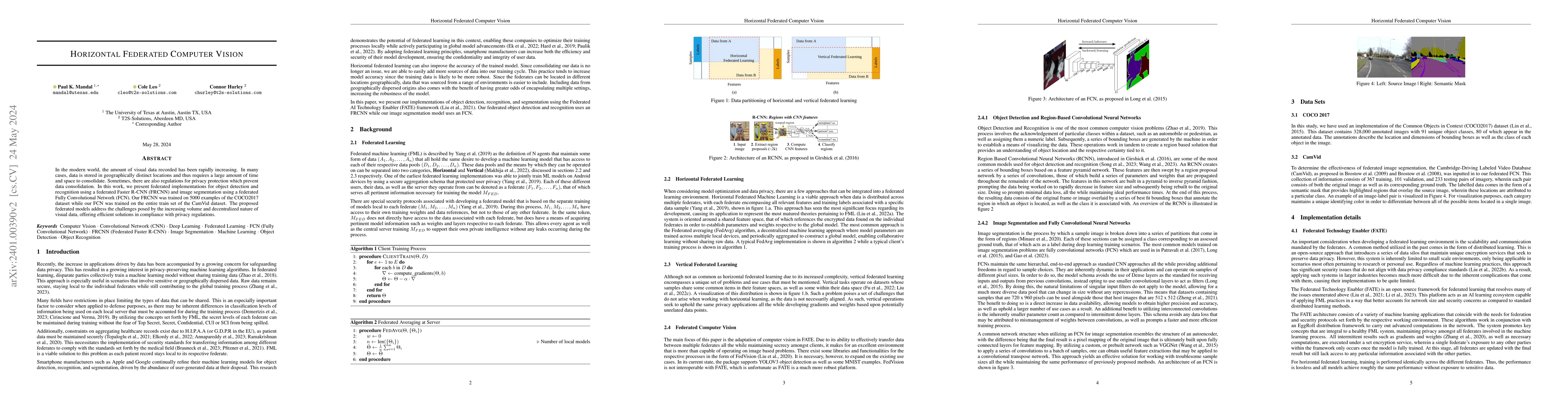 This paper proposes federated implementations for object detection and recognition (using federated Faster R-CNN) and image segmentation (using federated Fully Convolutional Network) to tackle the challenges of decentralized and large-scale visual data while adhering to privacy regulations. The models were trained on COCO2017 and CamVid datasets respectively.