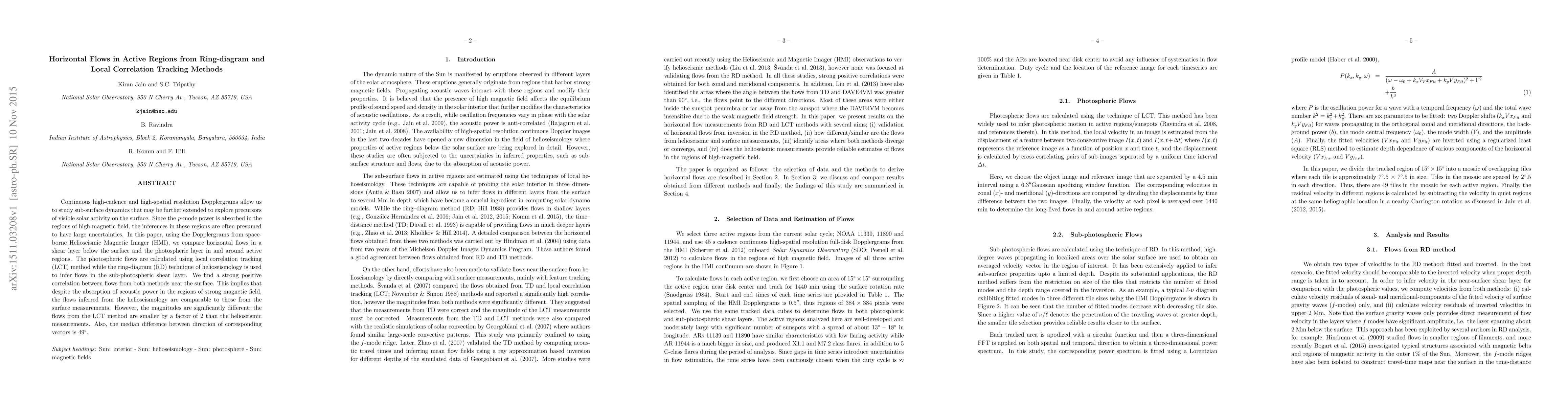 This paper compares horizontal flows in active regions using local correlation tracking and ring-diagram techniques, finding strong positive correlation near the surface but significantly different magnitudes and directions. Despite magnetic field absorption, helioseismic flows are comparable to surface measurements.