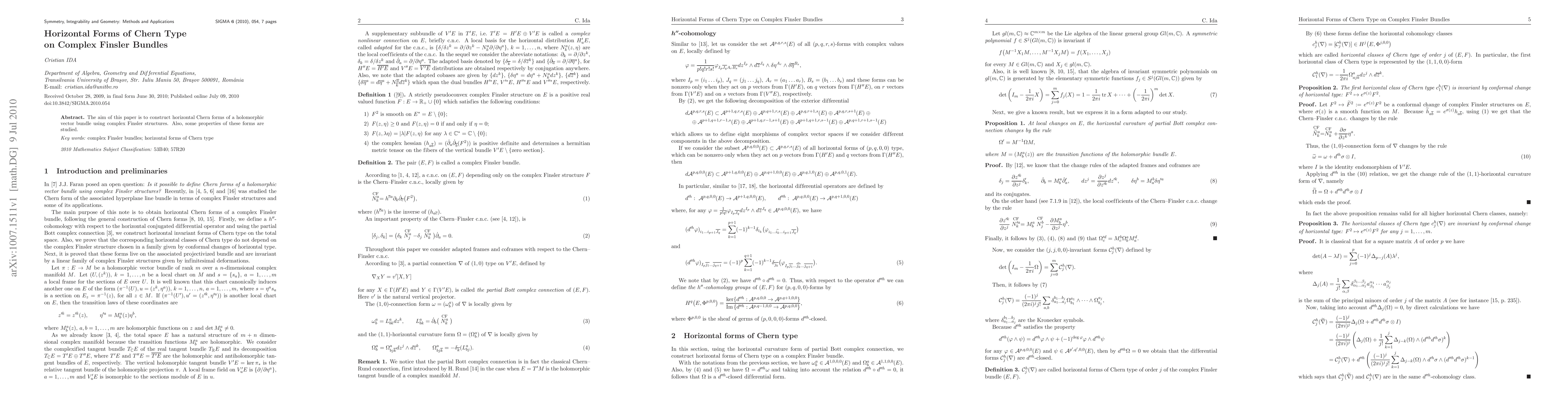 This paper constructs horizontal Chern forms for holomorphic vector bundles using complex Finsler structures, exploring their properties and implications.