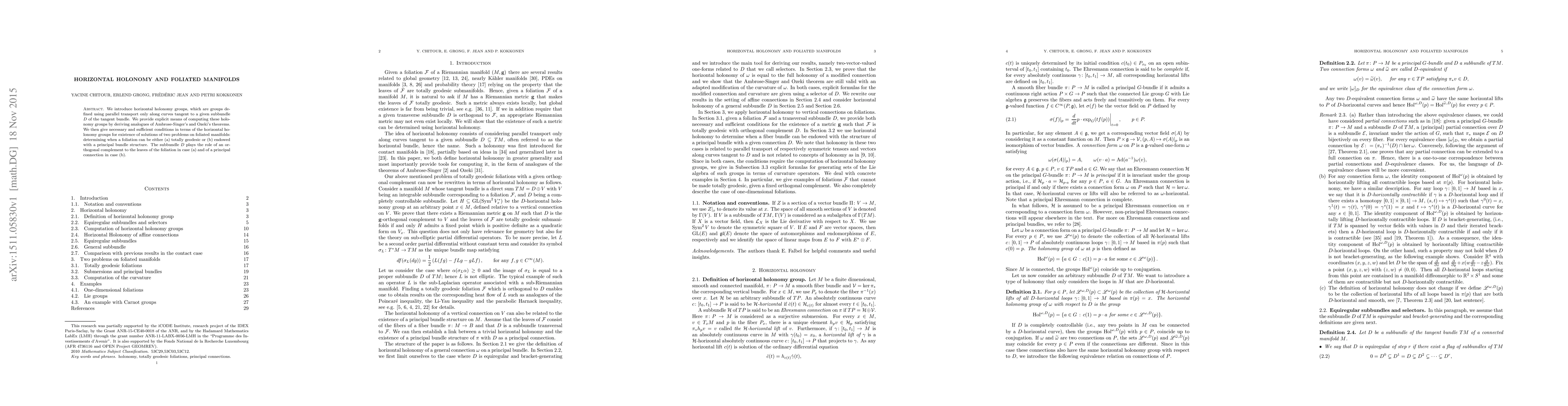 This paper introduces horizontal holonomy groups defined via parallel transport along curves tangent to a subbundle $D$ of the tangent bundle, and provides methods to compute these groups. It also establishes conditions for foliations to be totally geodesic or to have a principal bundle structure based on these holonomy groups.