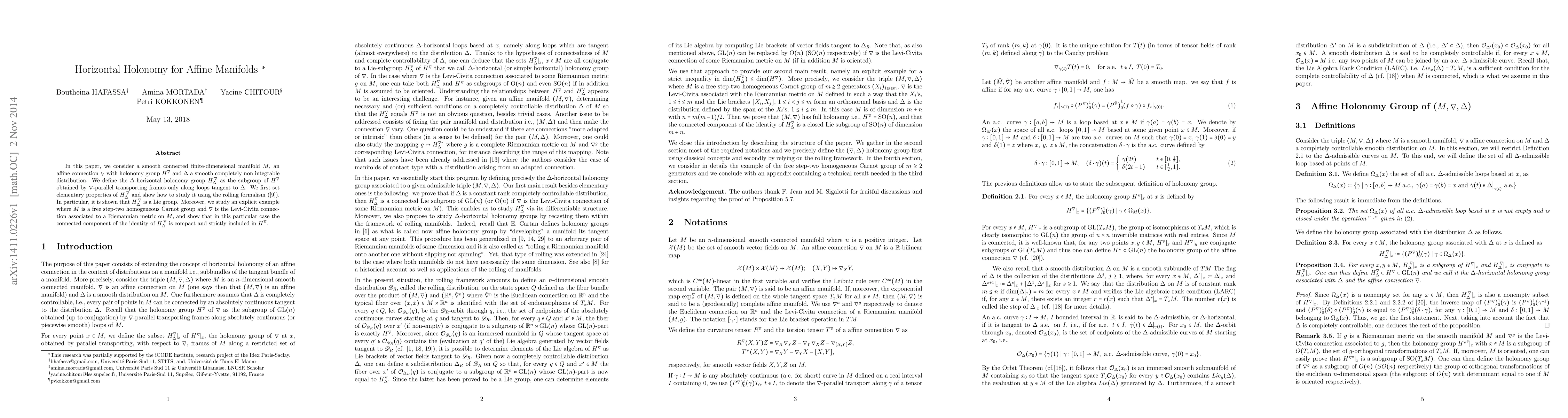 This paper defines the $\Delta$-horizontal holonomy group $H^{\;\nabla}_\Delta$ for affine manifolds, showing it is a Lie group and studying its properties using the rolling formalism. An explicit example involving a free step-two homogeneous Carnot group demonstrates that the connected component of the identity of $H^{\;\nabla}_\Delta$ is compact and strictly contained within the full holonomy group.