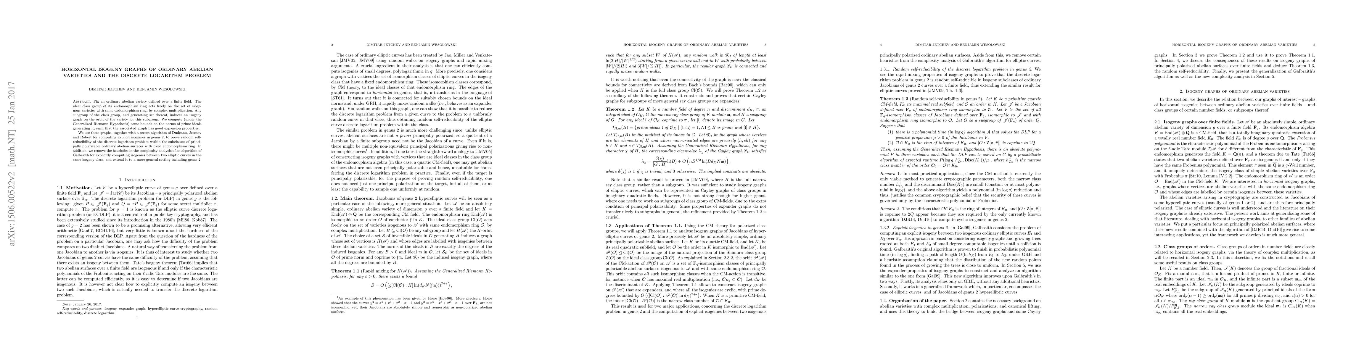Fix an ordinary abelian variety defined over a finite field. The ideal class group of its endomorphism ring acts freely on the set of isogenous varieties with same endomorphism ring, by complex multiplication. Any subgroup of the class group, and generating set thereof, induces an isogeny graph on the orbit of the variety for this subgroup. We compute (under the Generalized Riemann Hypothesis) some bounds on the norms of prime ideals generating it, such that the associated graph has good expansion properties. We use these graphs, together with a recent algorithm of Dudeanu, Jetchev and Robert for computing explicit isogenies in genus 2, to prove random self-reducibility of the discrete logarithm problem within the subclasses of principally polarizable ordinary abelian surfaces with fixed endomorphism ring. In addition, we remove the heuristics in the complexity analysis of an algorithm of Galbraith for explicitly computing isogenies between two elliptic curves in the same isogeny class, and extend it to a more general setting including genus 2.