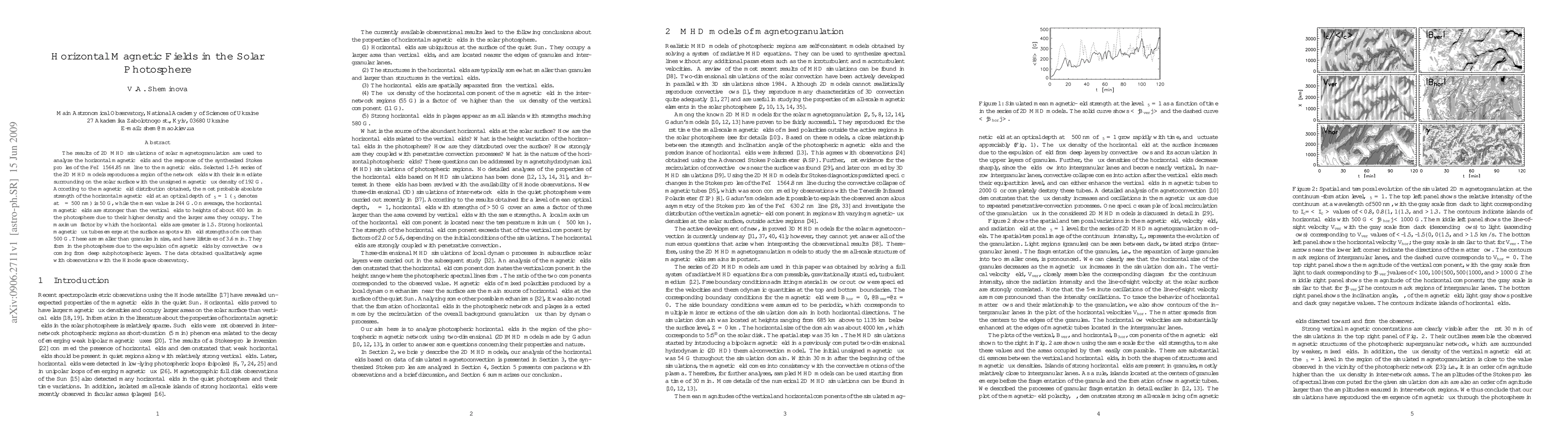 This paper uses 2D MHD simulations to analyze horizontal magnetic fields in the solar photosphere, finding that they are on average stronger than vertical fields and have a most probable strength of 50 G at optical depth tau_5 = 1. The simulations also reveal the emergence of strong horizontal magnetic flux tubes as spots with lifetimes of 3.6 min, which qualitatively agree with observations from the Hinode space observatory.