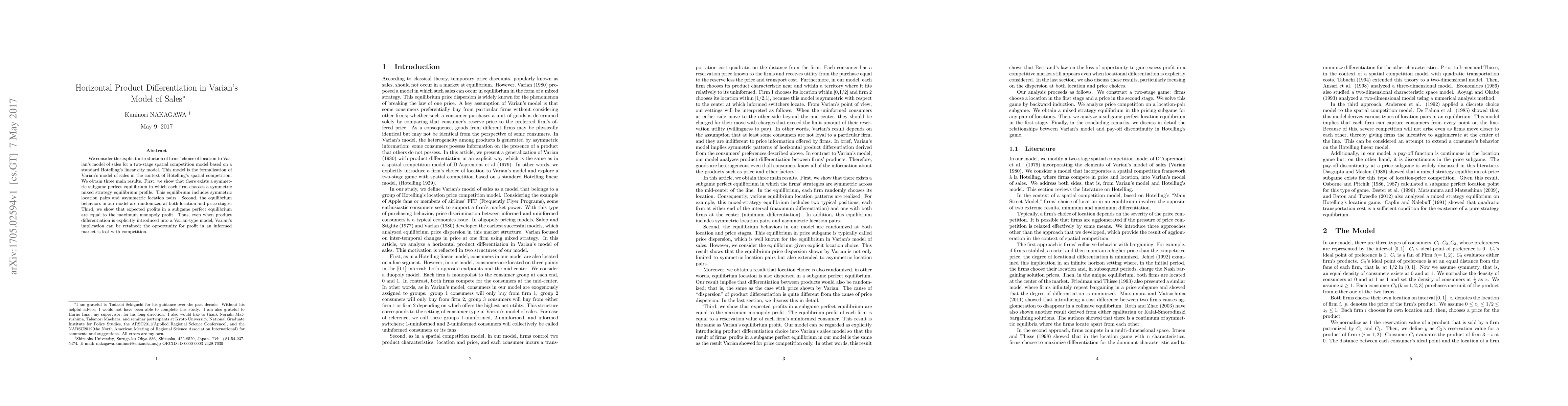 We consider the explicit introduction of firms' choice of location to Varian's model of sales for a two-stage spatial competition model based on a standard Hotelling's linear city model. This model is the formalization of Varian's model of sales in the context of Hotelling's spatial competition. We obtain three main results. First, we show that there exists a subgame perfect equilibrium in which each firm chooses a symmetric mixed strategy equilibrium profile. This equilibrium includes symmetric location pairs and asymmetric location pairs. Second, the equilibrium behaviors in our model are randomized at both location and price stages. Third, we show that expected profits in a subgame perfect equilibrium are equal to the maximum monopoly profit from an uninformed market. Thus, even when product differentiation is explicitly introduced into a Varian-type model, Varian's implication can be retained; the opportunity for profit in an informed market is lost with competition.