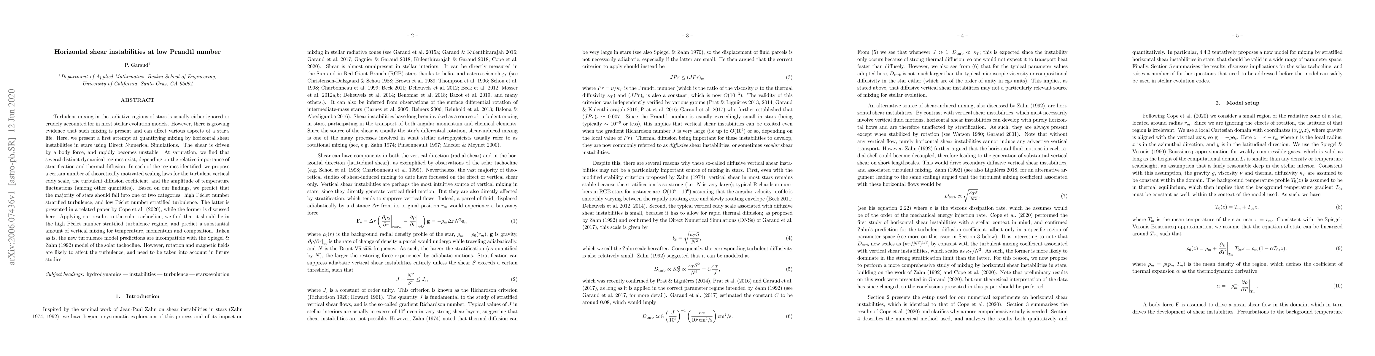Researchers used Direct Numerical Simulations to study horizontal shear instabilities in stars, finding two main regimes of turbulence based on stratification and thermal diffusion, with predictions for vertical mixing in the solar tachocline.