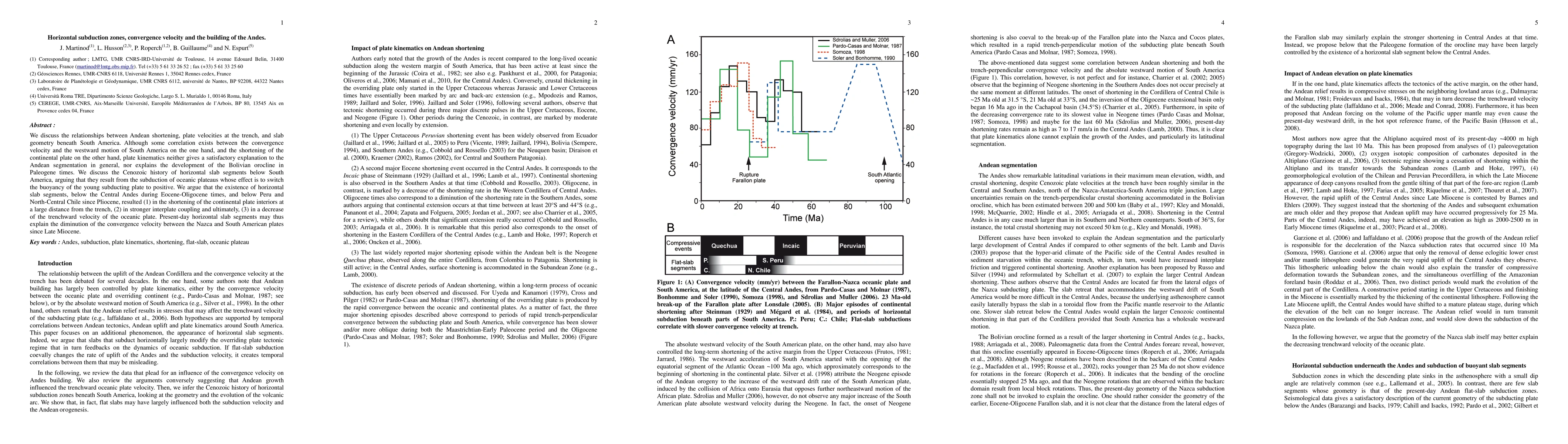 This paper explores the relationship between horizontal subduction zones, plate convergence velocity, and the formation of the Andes. It argues that while plate kinematics correlate with Andean shortening, they do not fully explain Andean segmentation or the Bolivian orocline. The presence of horizontal slab segments beneath South America is suggested to have caused significant continental plate shortening, stronger interplate coupling, and a reduction in the convergence velocity of the Nazca and South American plates since the Late Miocene.