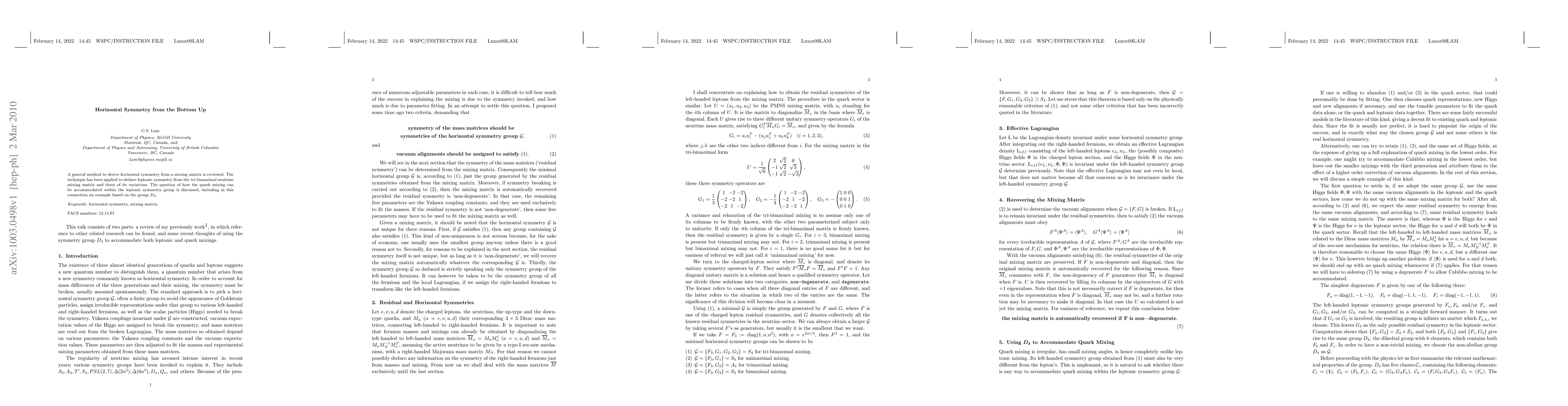 This paper reviews a method to derive horizontal symmetry from a mixing matrix, applying it to deduce leptonic symmetry from the tri-bimaximal neutrino mixing matrix and its variations. It also explores how quark mixing can fit within the leptonic symmetry group, exemplified by the $D_4$ group.