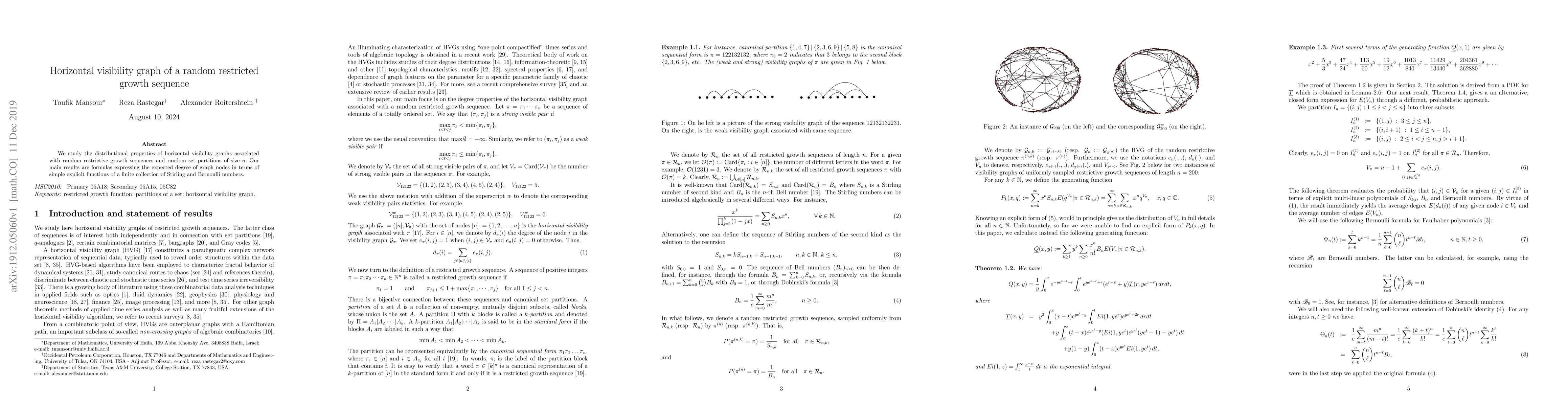 This paper investigates the distributional properties of horizontal visibility graphs linked to random restricted growth sequences and partitions, deriving formulas for the expected degree of nodes in terms of Stirling and Bernoulli numbers. The findings provide explicit functions for the expected degree based on combinatorial structures.