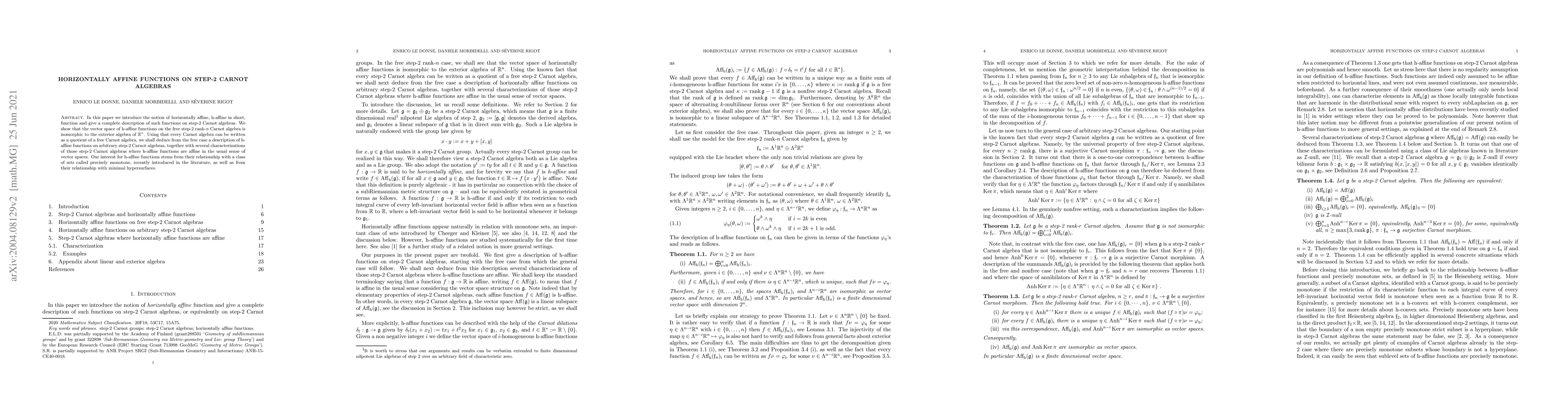 This paper defines horizontally affine (h-affine) functions on step-2 Carnot algebras and demonstrates their isomorphism to the exterior algebra of $\mathbb{R}^n$ for free step-2 rank-$n$ Carnot algebras. It extends this description to arbitrary step-2 Carnot algebras and explores their characterization in relation to monotone sets and minimal hypersurfaces.