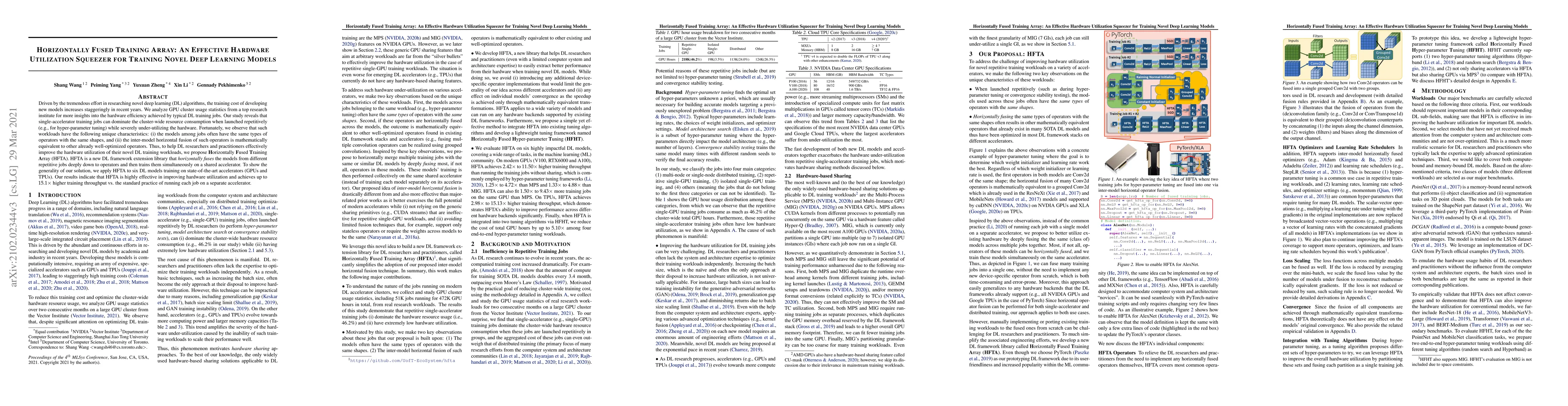 The research introduces Horizontally Fused Training Array (HFTA), a method to enhance hardware utilization in deep learning model training. HFTA combines operators from different repetitive jobs into a single model for simultaneous training on a shared accelerator, improving throughput by up to 15.1 times compared to traditional separate accelerator training, as demonstrated with six deep learning models on GPUs and TPUs.
