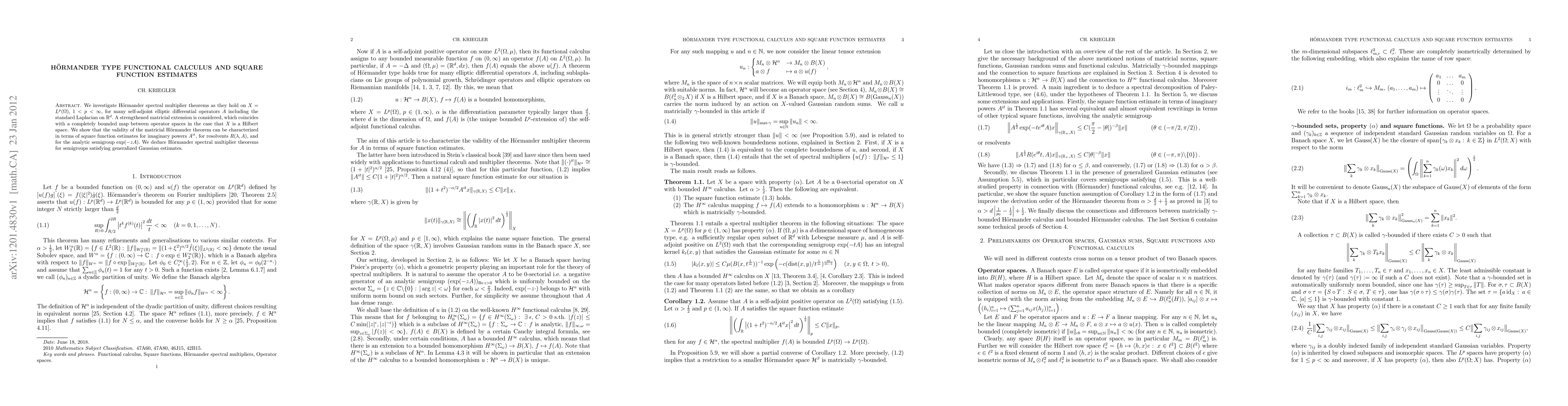 This paper explores H\"ormander type functional calculus and its connection to square function estimates for self-adjoint elliptic differential operators, particularly the Laplacian. It demonstrates that the matricial H\"ormander theorem's validity correlates with specific square function estimates, leading to generalized spectral multiplier theorems for semigroups with Gaussian estimates.