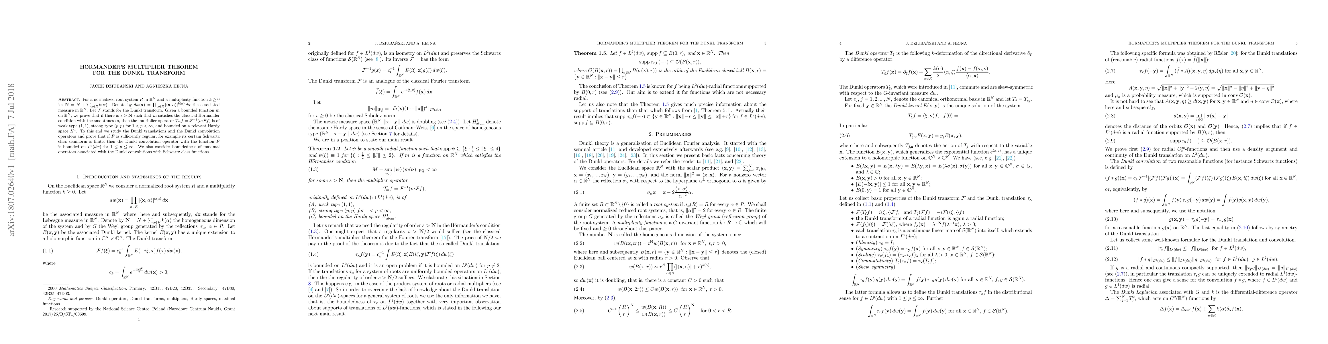 For a normalized root system $R$ in $\mathbb R^N$ and a multiplicity function $k\geq 0$ let $\mathbf N=N+\sum_{\alpha \in R} k(\alpha)$. Denote by $dw(\mathbf x)=\prod_{\alpha\in R}|\langle \mathbf x,\alpha\rangle|^{k(\alpha)}\, d\mathbf x $ the associated measure in $\mathbb R^N$. Let $\mathcal F$ stands for the Dunkl transform. Given a bounded function $m$ on $\mathbb R^N$, we prove that if there is $s>\mathbf N$ such that $m$ satisfies the classical H\"ormander condition with the smoothness $s$, then the multiplier operator $\mathcal T_mf=\mathcal F^{-1}(m\mathcal Ff)$ is of weak type $(1,1)$, strong type $(p,p)$ for $1