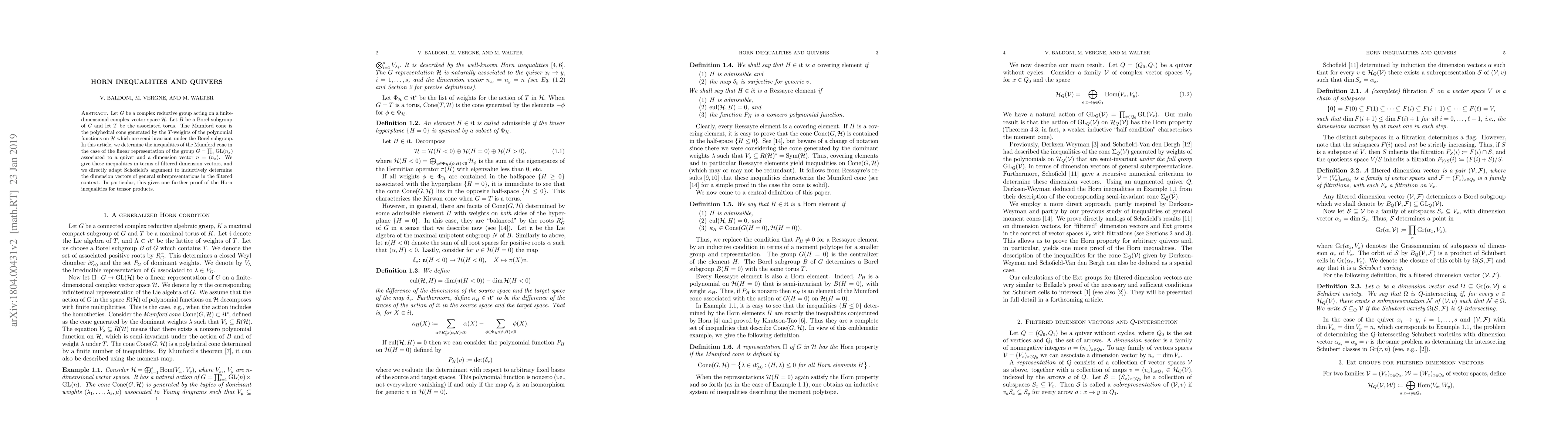 Let G be a complex reductive group acting on a finite-dimensional complex vector space H. Let B be a Borel subgroup of G and let T be the associated torus. The Mumford cone is the polyhedral cone generated by the T-weights of the polynomial functions on H which are semi-invariant under the Borel subgroup. In this article, we determine the inequalities of the Mumford cone in the case of the linear representation associated to a quiver and a dimension vector n=(n_x). We give these inequalities in terms of filtered dimension vectors, and we directly adapt Schofield's argument to inductively determine the dimension vectors of general subrepresentations in the filtered context. In particular, this gives one further proof of the Horn inequalities for tensor products.