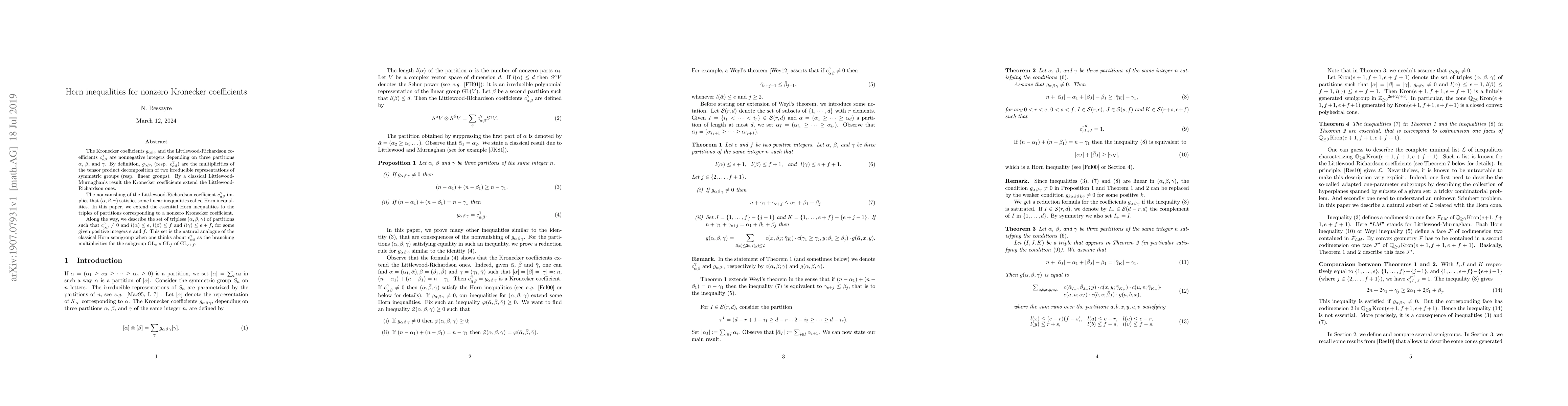This paper investigates the extension of Horn inequalities—which apply to Littlewood-Richardson coefficients—to nonzero Kronecker coefficients, providing linear inequalities that hold for the corresponding triples of partitions. The findings bridge the relationship between Kronecker and Littlewood-Richardson coefficients in symmetric group representations.