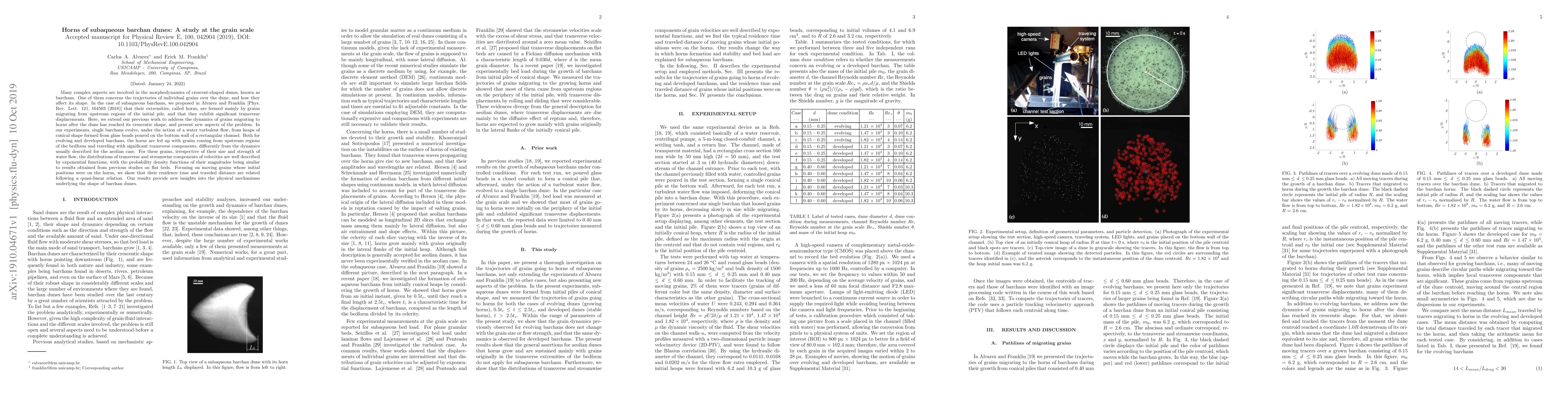 Many complex aspects are involved in the morphodynamics of crescent-shaped dunes, known as barchans. One of them concerns the trajectories of individual grains over the dune, and how they affect its shape. In the case of subaqueous barchans, we proposed in Alvarez and Franklin [Phys. Rev. Lett. 121, 164503 (2018)] that their extremities, called horns, are formed mainly by grains migrating from upstream regions of the initial pile, and that they exhibit significant transverse displacements. Here, we extend our previous work to address the dynamics of grains migrating to horns after the dune has reached its crescentic shape, and present new aspects of the problem. In our experiments, single barchans evolve, under the action of a water turbulent flow, from heaps of conical shape formed from glass beads poured on the bottom wall of a rectangular channel. Both for evolving and developed barchans, the horns are fed up with grains coming from upstream regions of the bedform and traveling with significant transverse components, differently from the dynamics usually described for the aeolian case. For these grains, irrespective of their size and strength of water flow, the distributions of transverse and streamwise components of velocities are well described by exponential functions, with the probability density functions of their magnitudes being similar to results obtained from previous studies on flat beds. Focusing on moving grains whose initial positions were on the horns, we show that their residence time and traveled distance are related following a quasi-linear relation. Our results provide new insights into the physical mechanisms underlying the shape of barchan dunes.