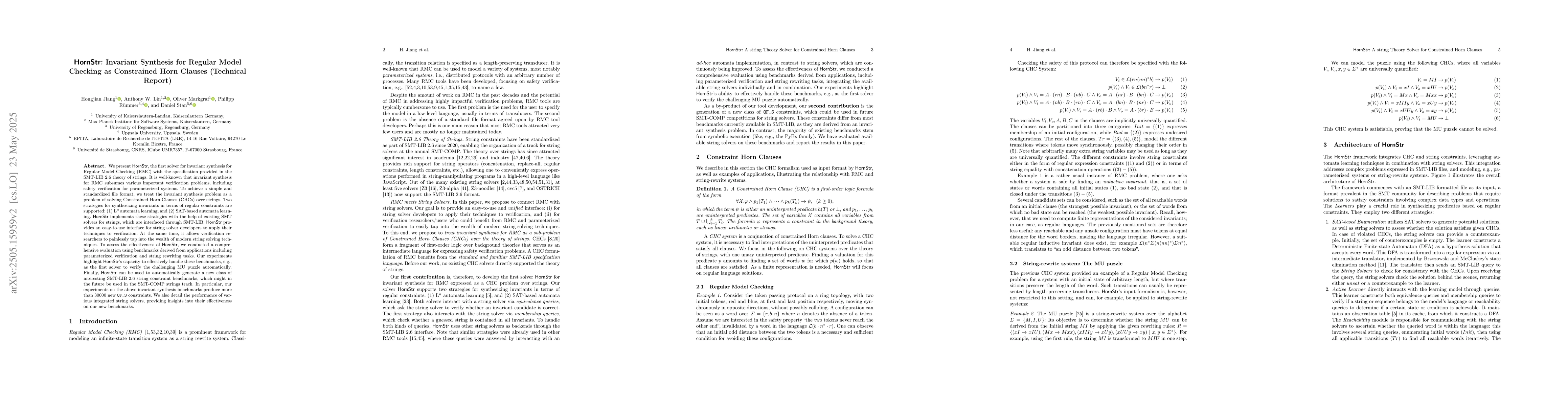 HornStr is a solver that helps find invariants for Regular Model Checking, automating tasks like safety verification for parameterized systems, using Constrained Horn Clauses over strings.