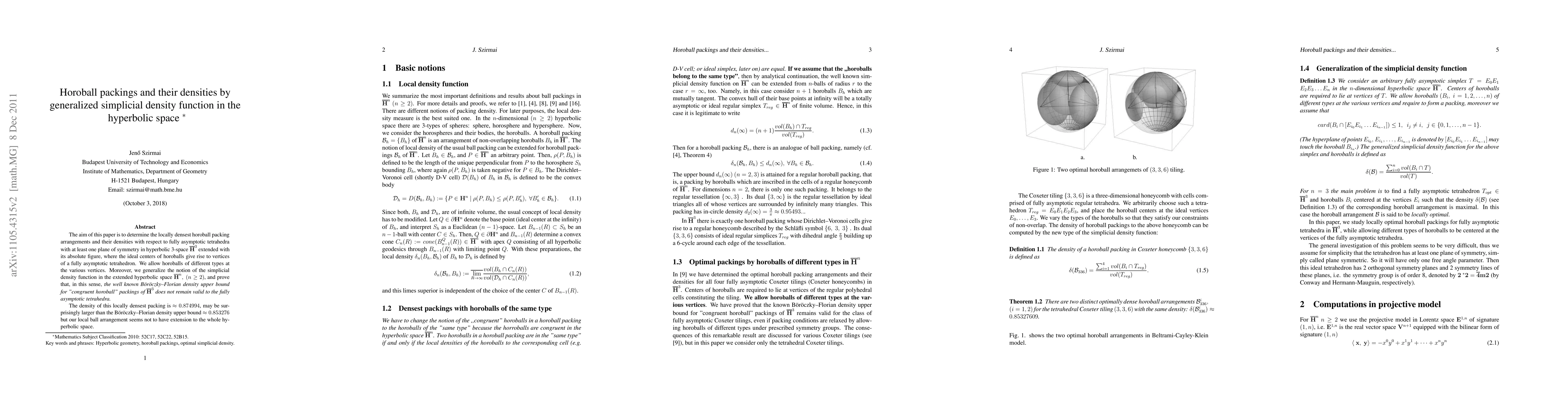 The aim of this paper to determine the locally densest horoball packing arrangements and their densities with respect to fully asymptotic tetrahedra with at least one plane of symmetry in hyperbolic 3-space $\bar{\mathbf{H}}^3$ extended with its absolute figure, where the ideal centers of horoballs give rise to vertices of a fully asymptotic tetrahedron. We allow horoballs of different types at the various vertices. Moreover, we generalize the notion of the simplicial density function in the extended hyperbolic space $\bar{\mathbf{H}}^n, ~(n \ge 2)$, and prove that, in this sense, {\it the well known B\"or\"oczky--Florian density upper bound for "congruent horoball" packings of $\bar{\mathbf{H}}^3$ does not remain valid to the fully asymptotic tetrahedra.} The density of this locally densest packing is $\approx 0.874994$, may be surprisingly larger than the B\"or\"oczky--Florian density upper bound $\approx 0.853276$ but our local ball arrangement seems not to have extension to the whole hyperbolic space.