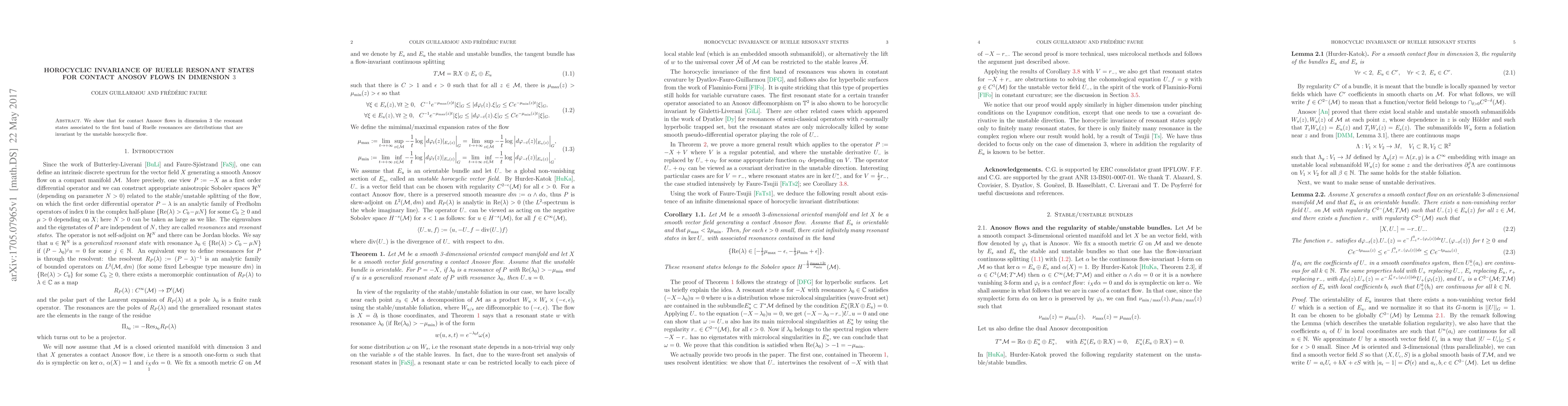 Summary: This research demonstrates that in smooth contact Anosov flows of dimension 3, the resonant states linked to the first Ruelle resonance band are distributions that lose their effect through the unstable derivative, confirming their horocyclic invariance.