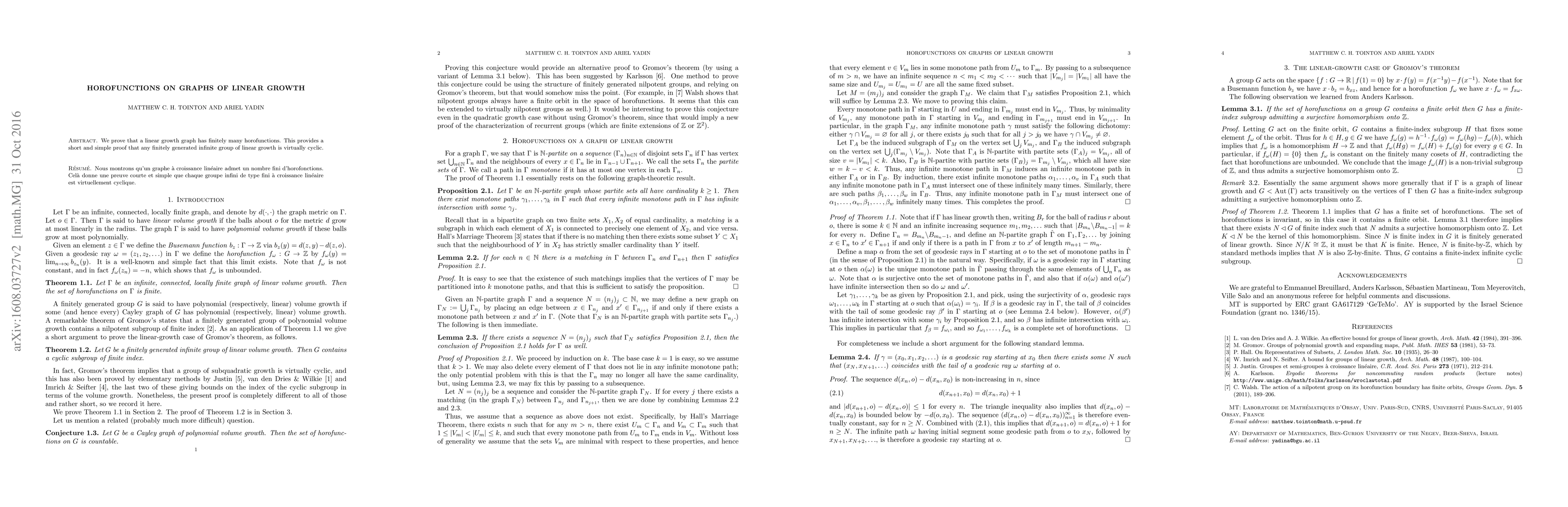 We prove that a linear growth graph has finitely many horofunctions. This provides a short and simple proof that any finitely generated infinite group of linear growth is virtually cyclic.