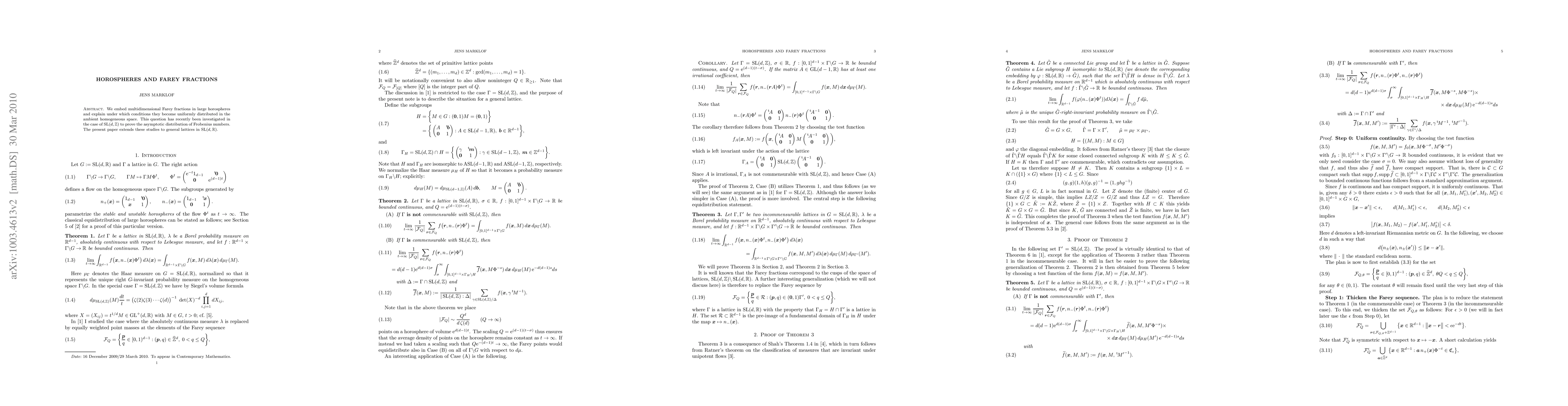 We embed multidimensional Farey fractions in large horospheres and explain under which conditions they become uniformly distributed in the ambient homogeneous space. This question has recently been investigated in the case of SL(d,Z) to prove the asymptotic distribution of Frobenius numbers. The present paper extends these studies to general lattices in SL(d,R).