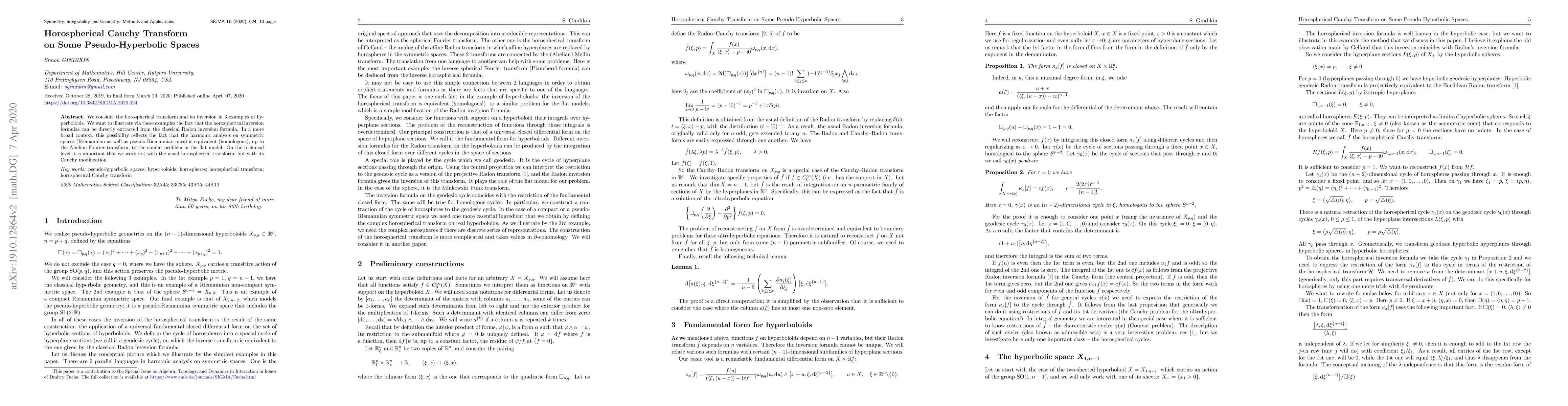 This paper explores the horospherical Cauchy transform and its inversion on three pseudo-hyperbolic spaces, demonstrating that these inversion formulas derive from the classical Radon inversion formula. It highlights the equivalence of harmonic analysis on symmetric spaces and the flat model, facilitated by the Abelian Fourier transform.
