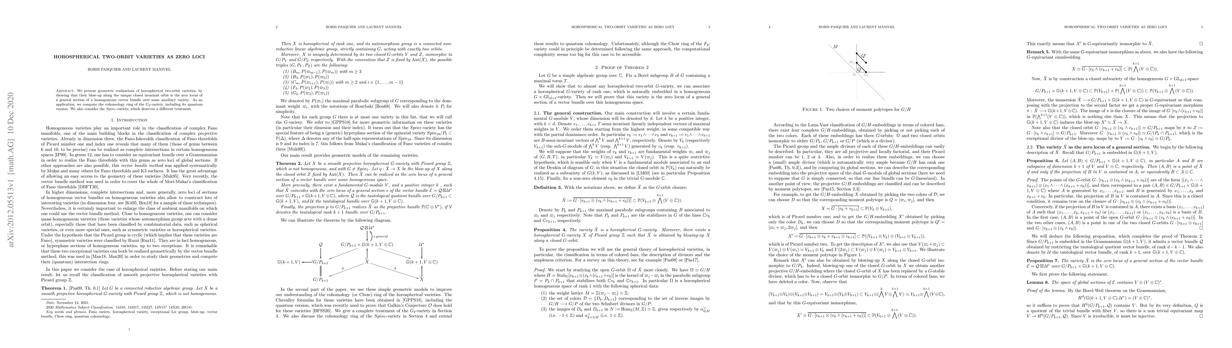 We present geometric realizations of horospherical two-orbit varieties, by showing that their blow-up along the unique closed-invariant orbit is the zero locus of a general section of a homogeneous vector bundle over some auxiliary variety. As an application, we compute the cohomology ring of the $G_2$-variety, including its quantum version. We also consider the Spin$_7$-variety, which deserves a different treatment.