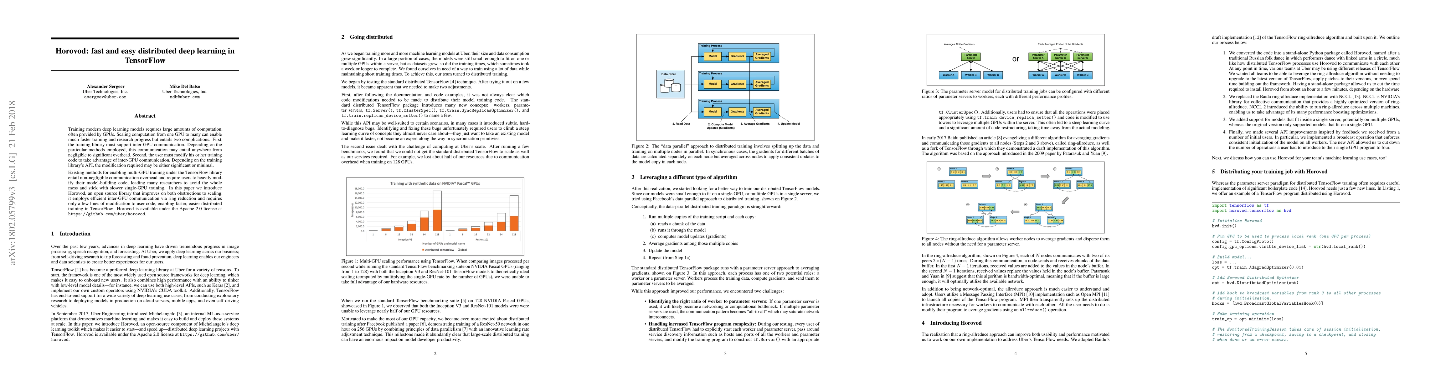 Horovod is an open-source library designed to simplify and accelerate distributed deep learning in TensorFlow by minimizing inter-GPU communication overhead and requiring minimal code modifications from users. It is available under the Apache 2.0 license.