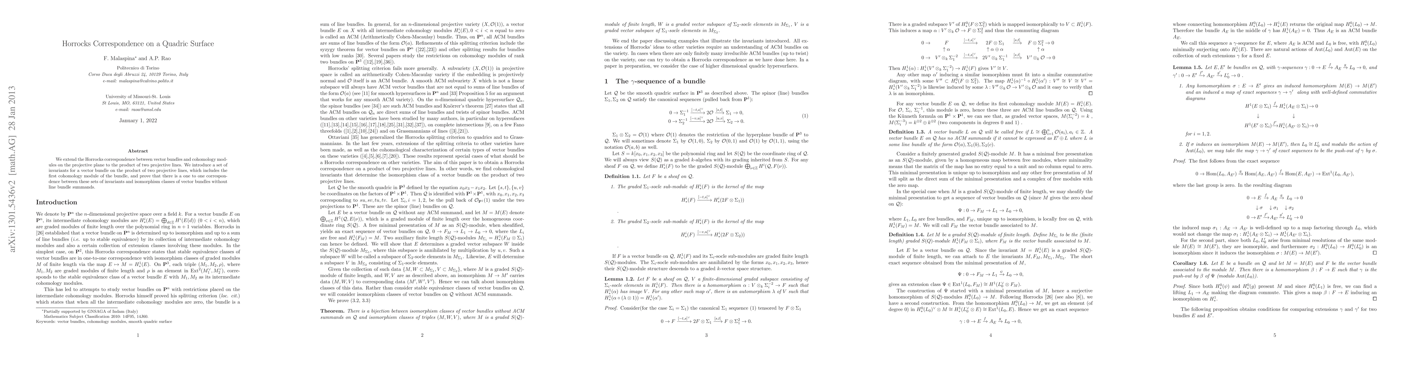 This paper extends the Horrocks correspondence from the projective plane to the product of two projective lines, introducing new invariants including the first cohomology module, and proving a one-to-one correspondence between these invariants and vector bundles without line bundle summands.