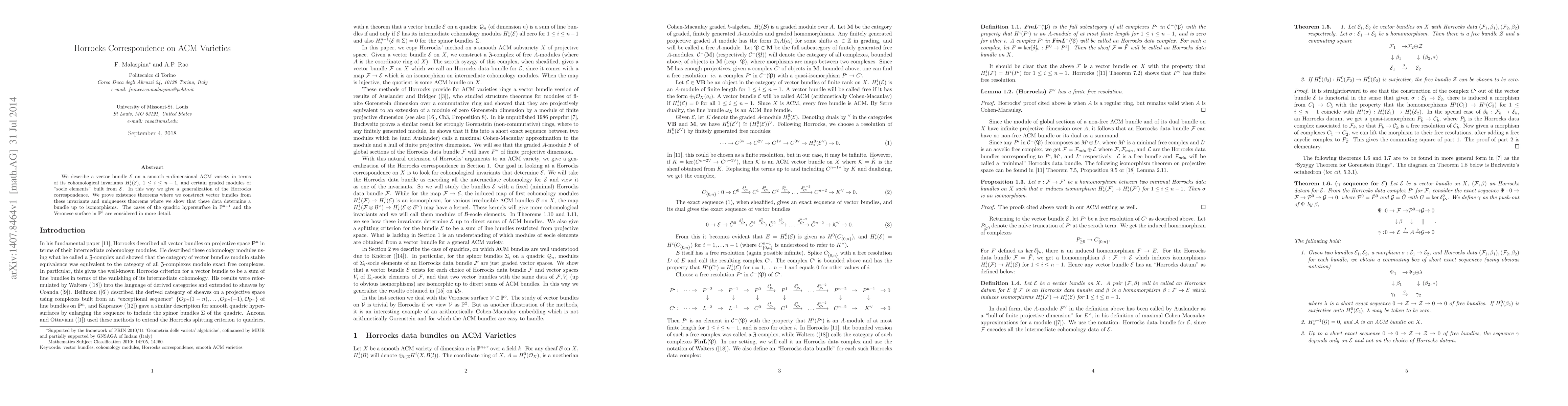 This paper generalizes the Horrocks correspondence by expressing vector bundles on smooth ACM varieties in terms of their cohomological invariants and socle elements, proving both existence and uniqueness of such bundles. Detailed cases of quadric hypersurfaces and Veronese surfaces are analyzed.