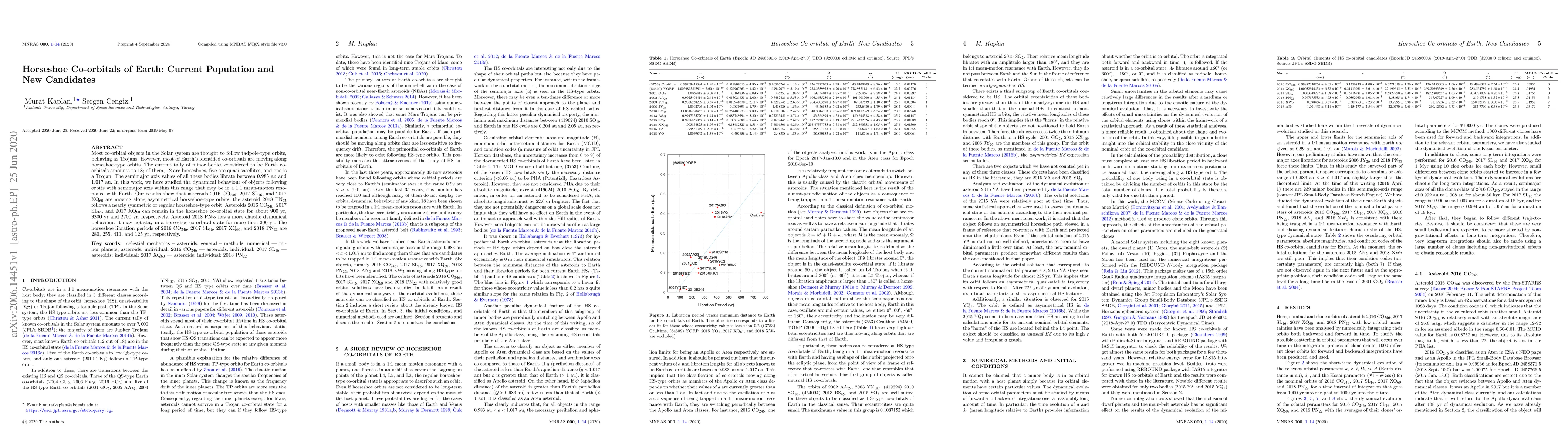 This paper identifies Earth's co-orbital minor bodies, with 12 of the 18 being horseshoe-type orbits. It introduces new candidates 2016 CO$_{246}$, 2017 SL$_{16}$, 2017 XQ$_{60}$, and 2018 PN$_{22}$, detailing their dynamical behaviors and horseshoe orbit durations, with 2017 SL$_{16}$ expected to remain in its state for 3300 years.