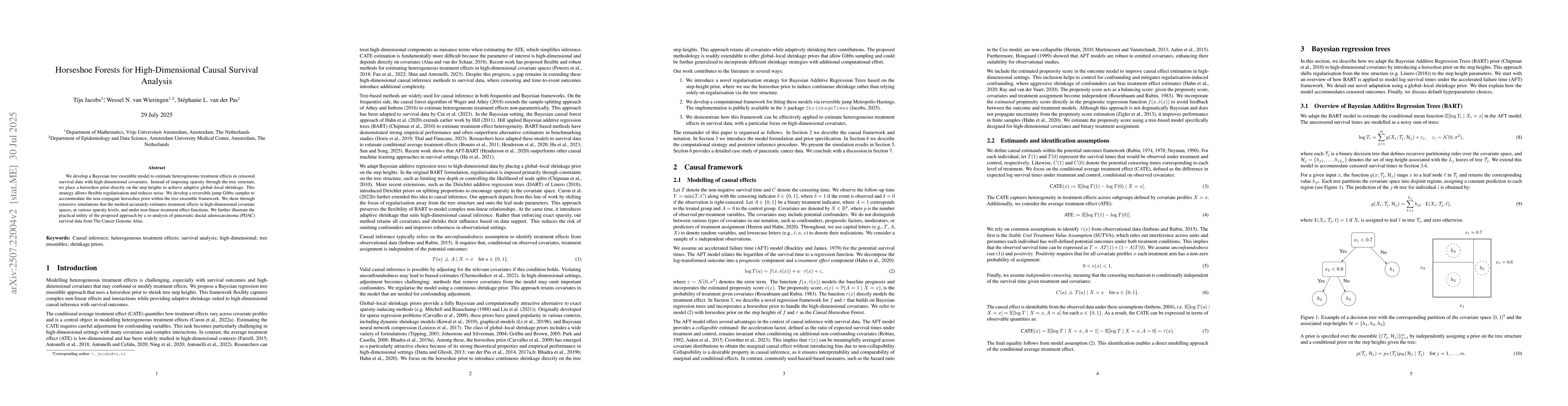 We develop a Bayesian tree ensemble model to estimate heterogeneous treatment effects in censored survival data with high-dimensional covariates. Instead of imposing sparsity through the tree structure, we place a horseshoe prior directly on the step heights to achieve adaptive global-local shrinkage. This strategy allows flexible regularisation and reduces noise. We develop a reversible jump Gibbs sampler to accommodate the non-conjugate horseshoe prior within the tree ensemble framework. We show through extensive simulations that the method accurately estimates treatment effects in high-dimensional covariate spaces, at various sparsity levels, and under non-linear treatment effect functions. We further illustrate the practical utility of the proposed approach by a re-analysis of pancreatic ductal adenocarcinoma (PDAC) survival data from The Cancer Genome Atlas.