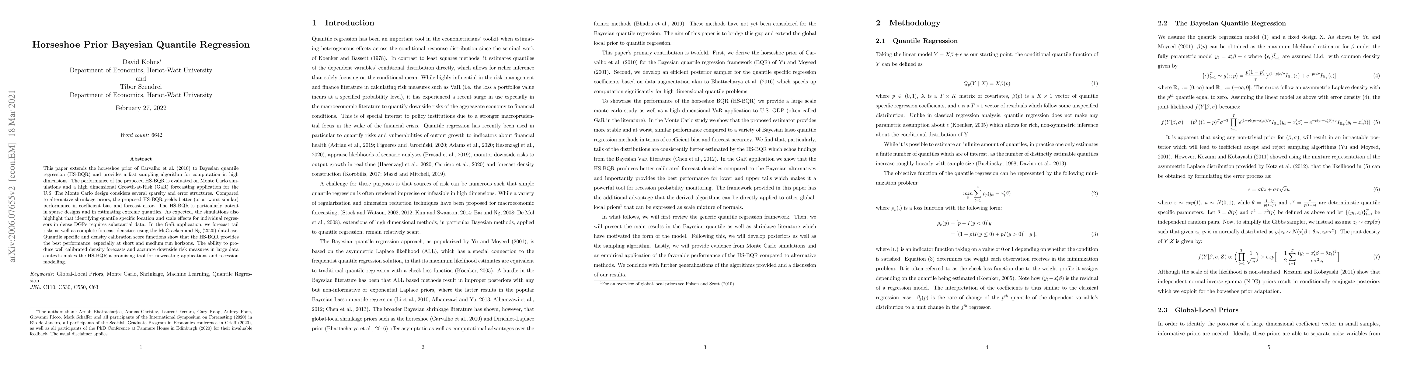 This paper introduces a horseshoe prior Bayesian quantile regression (HS-BQR) method, demonstrating superior performance in coefficient bias and forecast error compared to alternative shrinkage priors, especially in sparse designs and extreme quantiles. The HS-BQR effectively forecasts tail risks and complete density forecasts, showing best performance in calibration and downside risk measures, making it valuable for nowcasting and recession modeling.