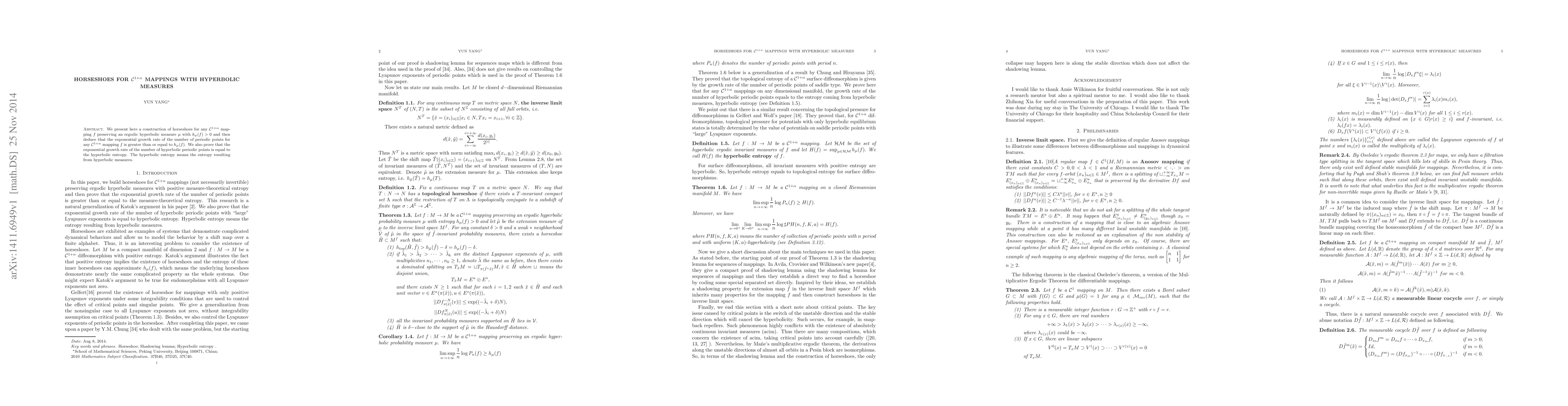 Researchers develop a way to create horseshoes for any $oxed{ ext{C}^{1+eta}}$ mapping with hyperbolic measures, linking this to the growth rate of periodic points and their entropy.
