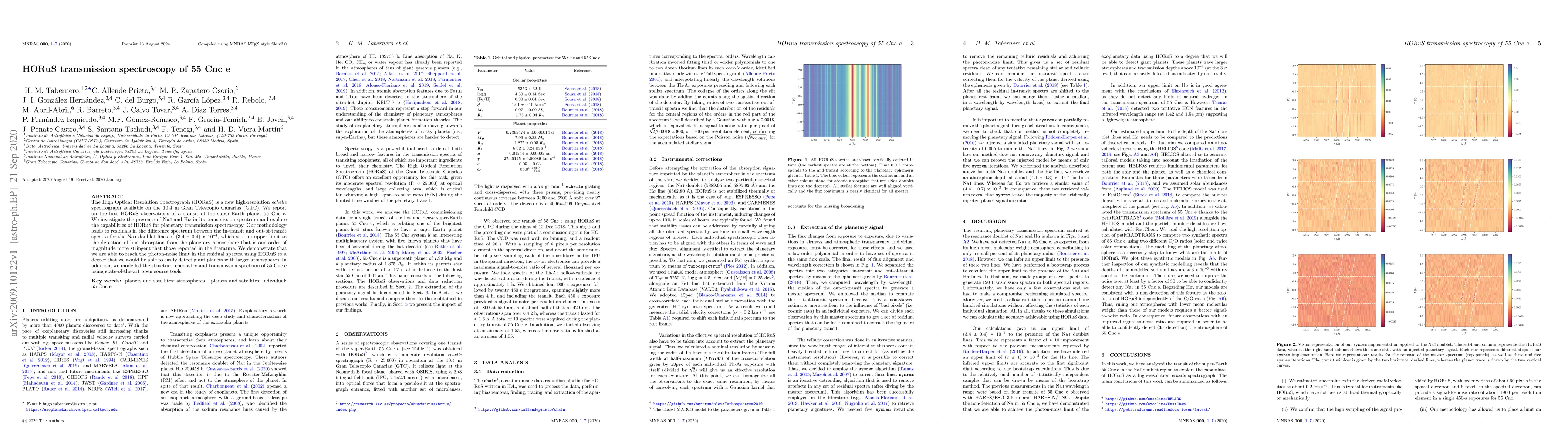 The HORuS spectrograph on the Gran Telescopio Canarias observed the transit of the planet 55 Cnc e, setting a stringent upper limit on Na I absorption in its atmosphere. The study demonstrates HORuS's capability to reach photon-noise limits, indicating its potential for detecting larger exoplanet atmospheres.