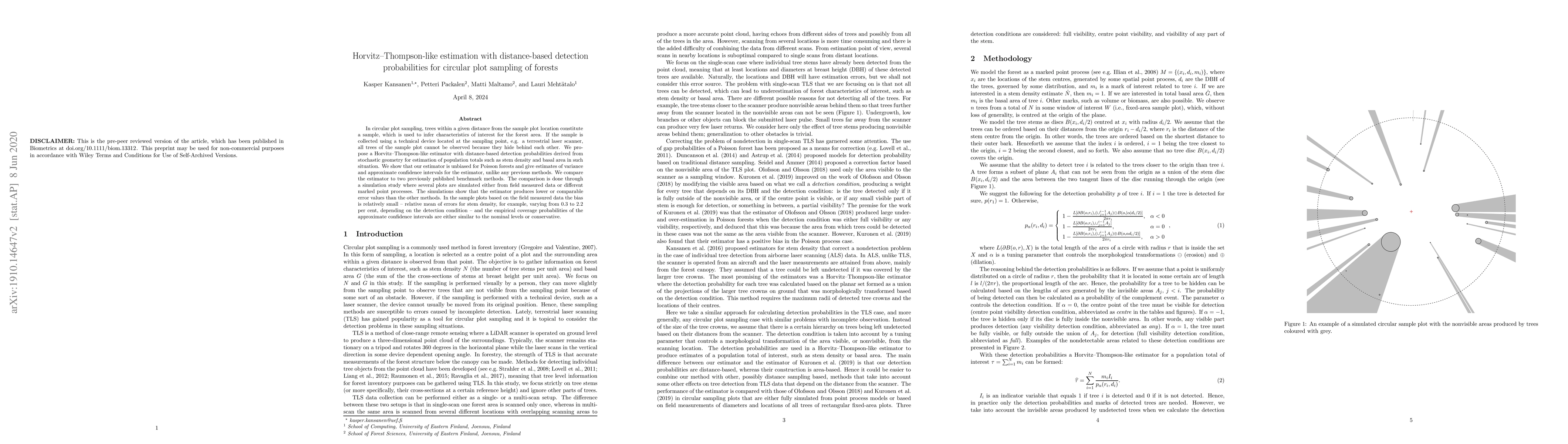 This paper proposes a Horvitz-Thompson-like estimator for circular plot sampling in forest inventories, using distance-based detection probabilities derived from stochastic geometry. The new method shows unbiasedness, lower or comparable error values, and better confidence interval coverage compared to existing methods, as demonstrated through simulation studies.