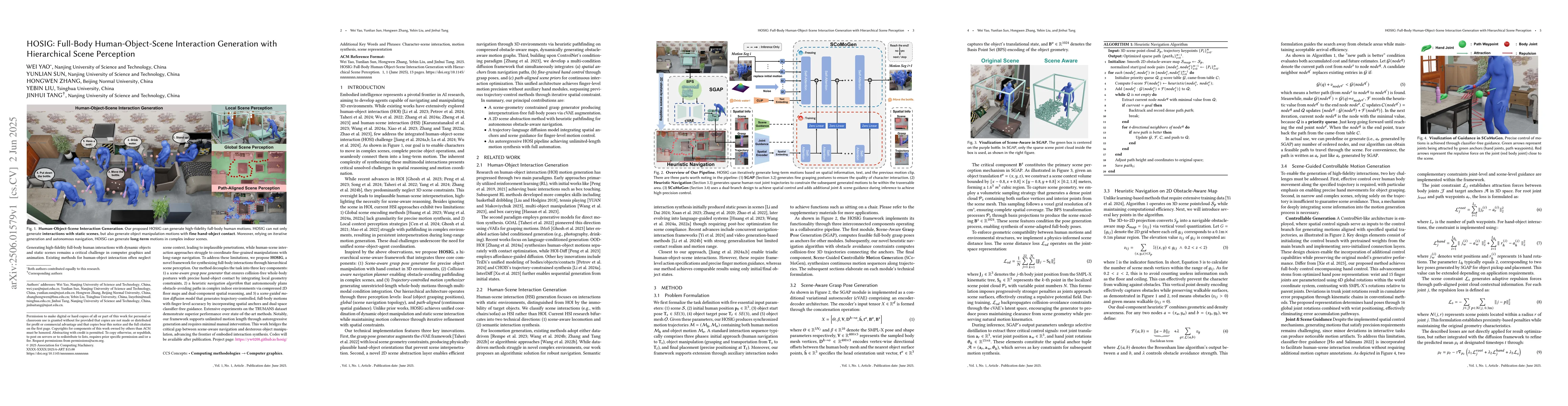 HOSIG introduces a hierarchical scene perception approach for generating full-body human-object-scene interactions, combining scene-aware grasp generation, autonomous navigation, and trajectory-controlled motion synthesis.