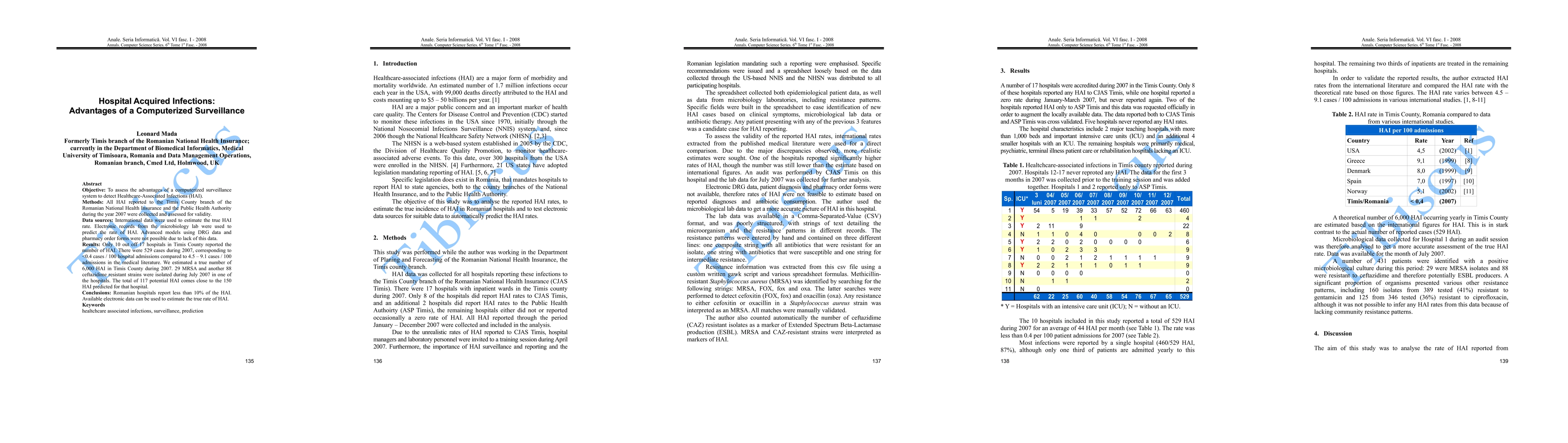 To asses the advantages of a computerized surveillance system to detect Healthcare-Associated Infections (HAI). All HAI reported to the Timis County branch of the Romanian National Health Insurance and the Public Health Authority during the year 2007 were collected and assessed for validity