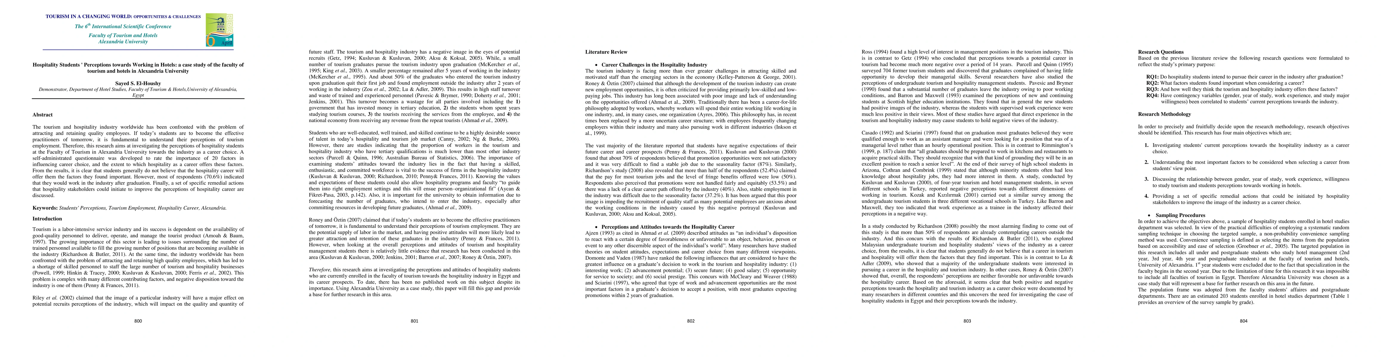This study investigates the perceptions of hospitality students at Alexandria University's Faculty of Tourism towards the industry as a career, revealing that while 70.6% intend to work in the field post-graduation, they doubt it will meet their important career factors. Recommendations for stakeholders to improve career perceptions are provided.